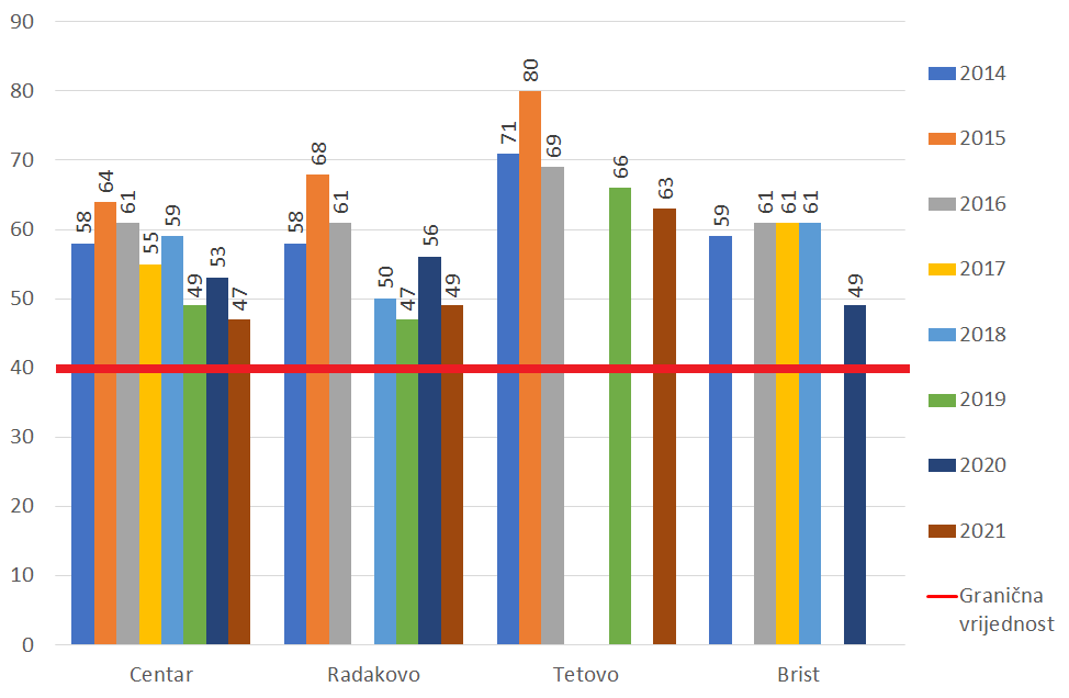 Prema izvještaju o kvalitetu zraka u Federaciji BiH, Zenica i dalje ima visoke godišnje prosječne koncentracije sumpor dioksida, koje su iznad granične vrijednosti na svim mjernim stanicama. I broj dana sa dnevnom koncentracijom sumpordioksida višom od granične vrijednosti (>125 µg/m3) u 2021. godini na svim mjernim stanicama u Zenici i dalje je daleko iznad dozvoljenih 3 dana godišnje. Kreće se od 32 dana u Vranduku i Tetovu do 67 dana na mjernoj stanici Centar.