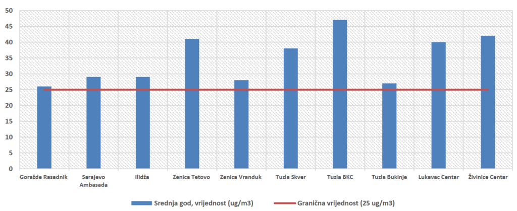 Koncentracije fine prašine PM2.5 mjerene su samo na mjernim stanicama Tetovo i Vranduk tokom 2021. godine i zabilježene su vrijednosti znatno iznad granične vrijednosti od 25 µg/m3.