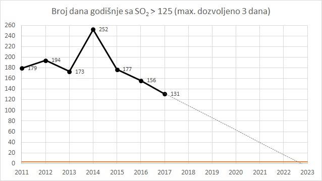 Prošle godine 131 dan imali smo dnevni prosjek SO2 iznad dozvoljene granice od 125 mikrograma po m3, što je prikazano i tabelom