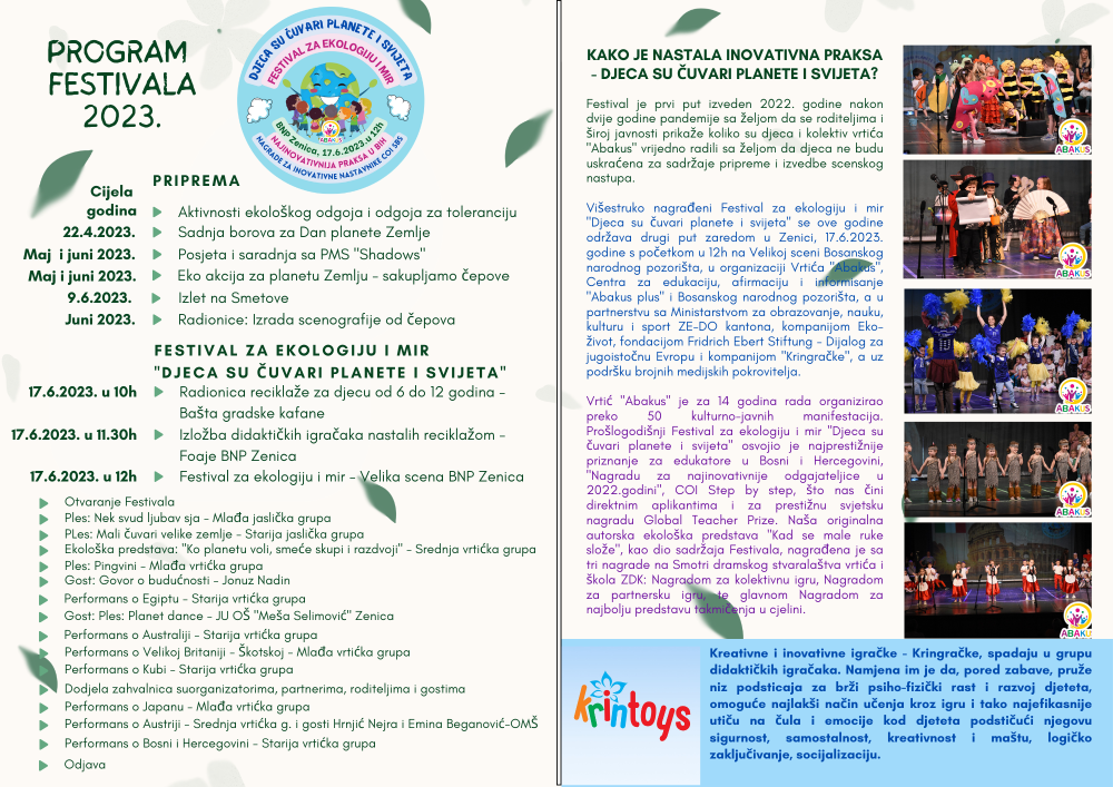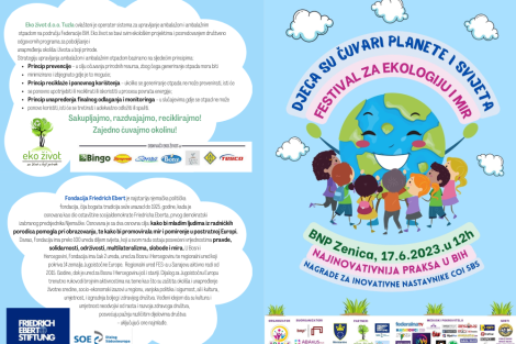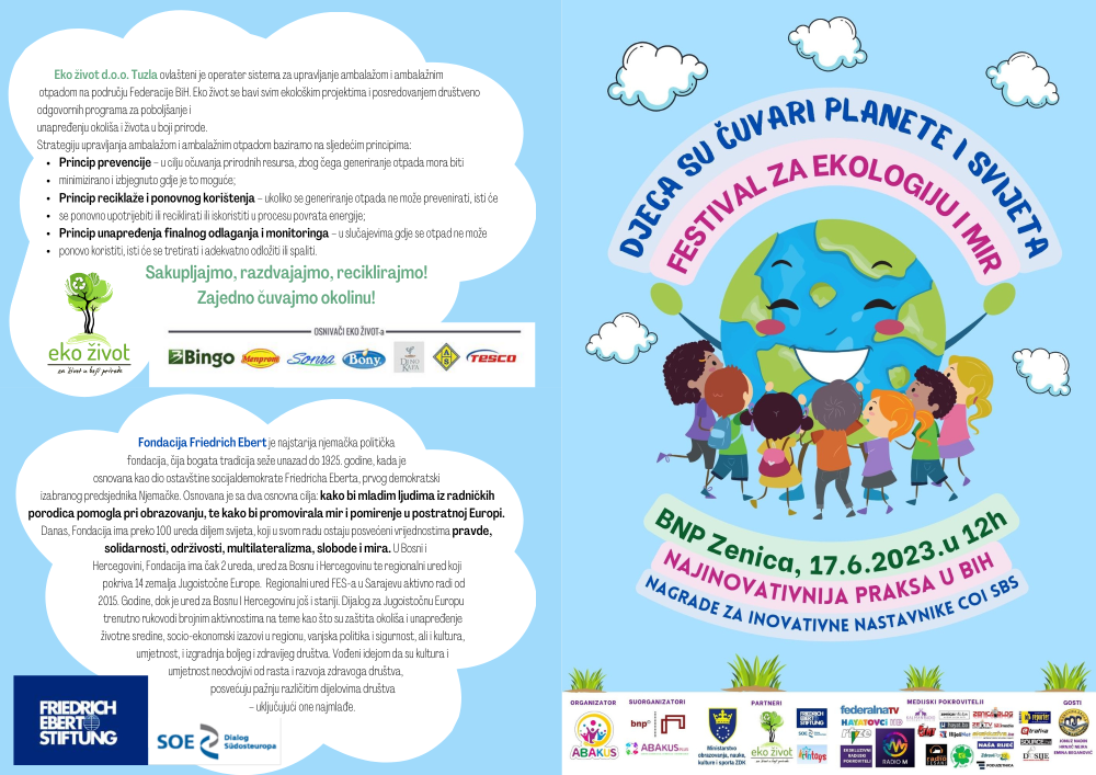 Podsjećamo, višestruko nagrađeni Festival za ekologiju i mir “Djeca su čuvari planete i svijeta” će se održati drugi put zaredom u Zenici, 17.6.2023.godine s početkom u 12h na Velikoj sceni Bosanskog narodnog pozorišta, u organizaciji Vrtića “Abakus”, Centra za edukaciju, afirmaciju i informisanje “Abakus plus” i Bosanskog narodnog pozorišta, a u partnerstvu sa kompanijom Eko-život i fondacijom Fridrich Ebert Stiftung – Dijalog za jugoistočnu Evropu.