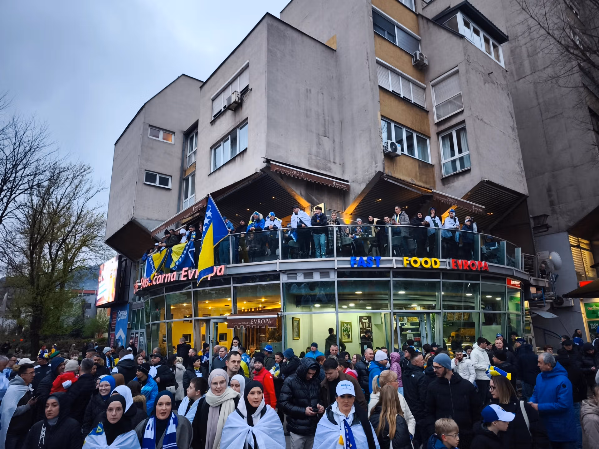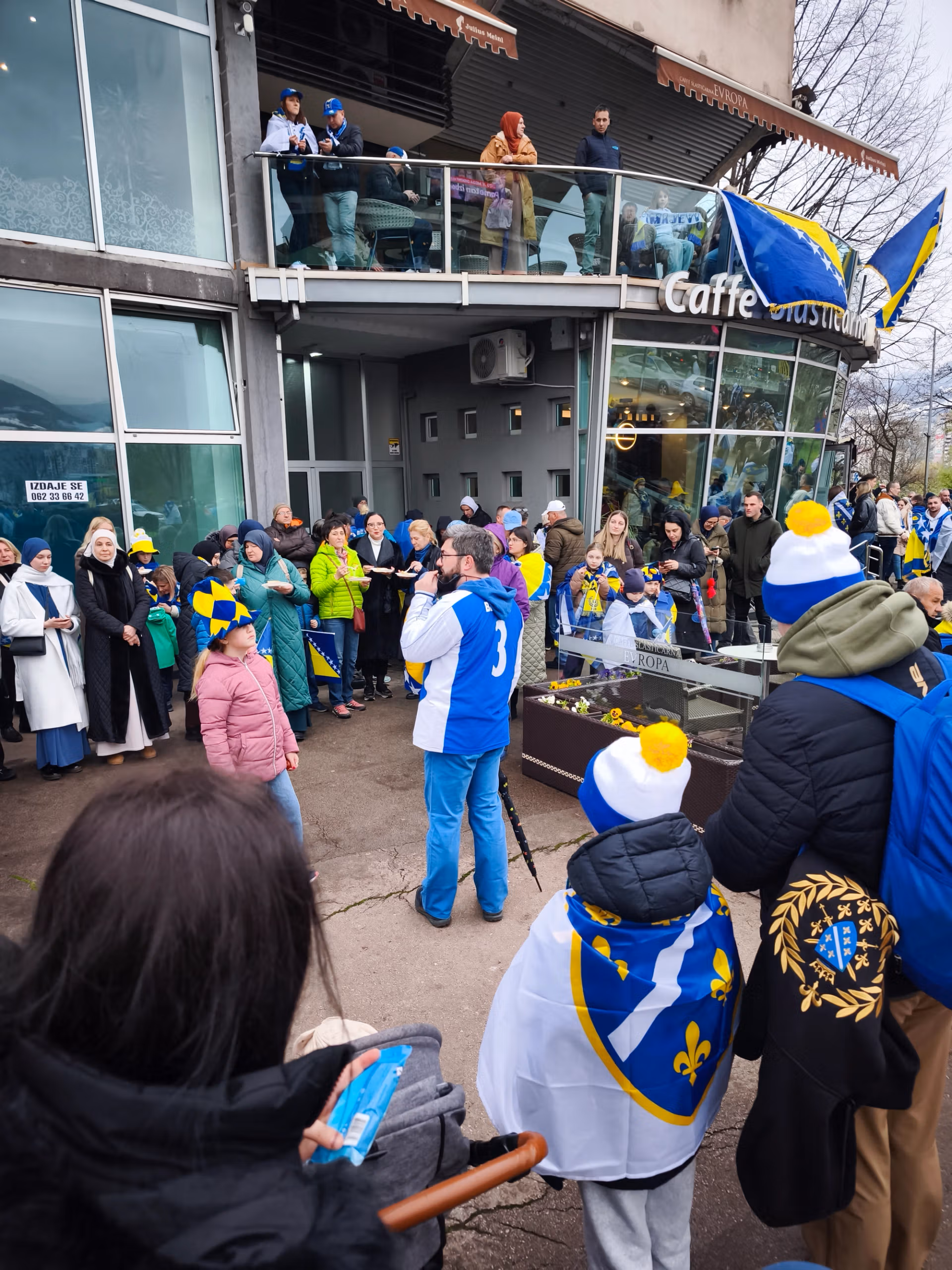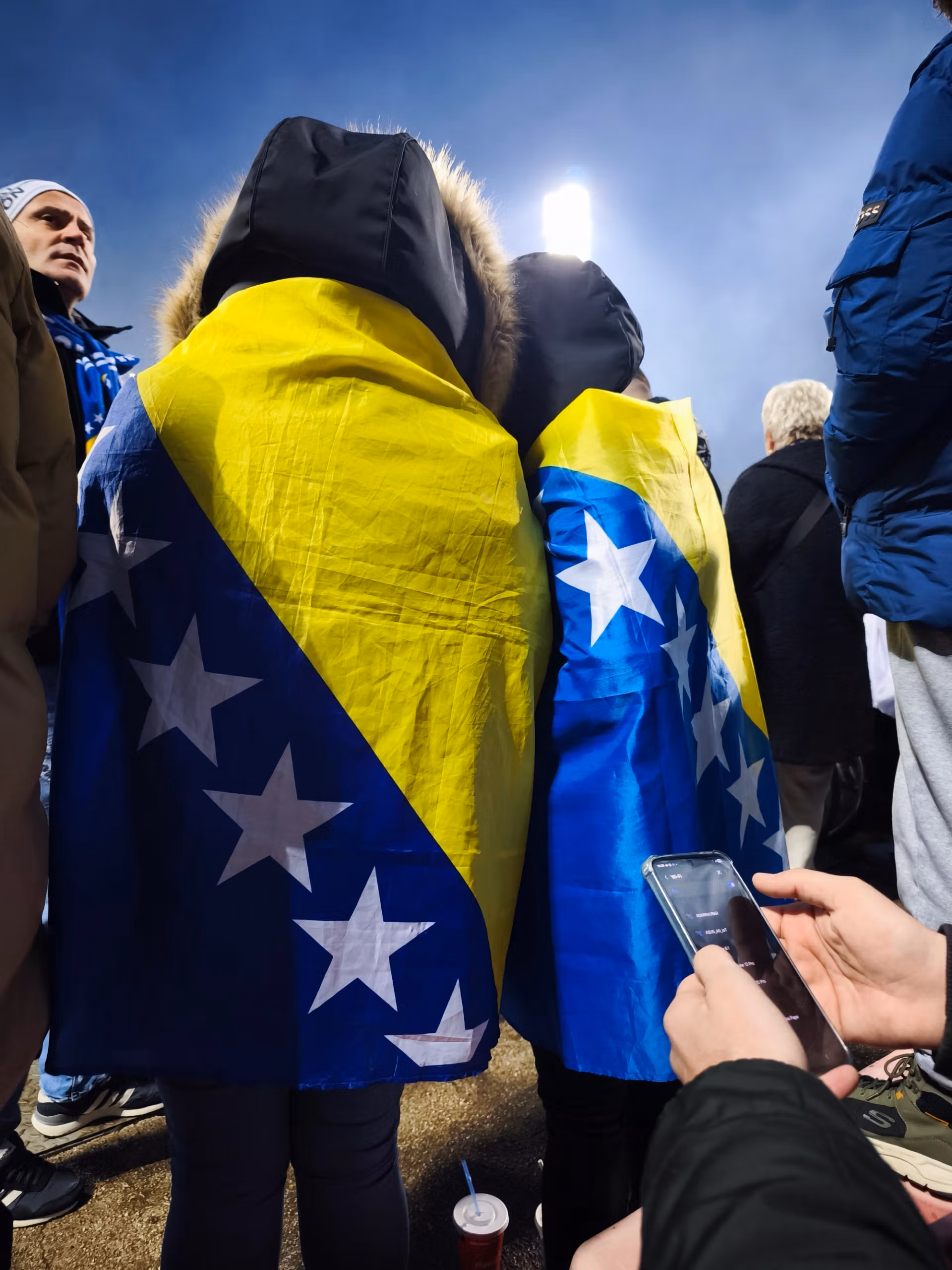 Dok obilazim grad, zvoni mi telefon. Prijatelj kaže nekoliko jednostavnih riječi: “Našao sam kartu za tebe.” Bez riječi sam; nisam na to računao, ali ovaj gest me iznenađuje i istovremeno me čini toliko sretnim. Volio bih da i ja mogu toliko toga dati svojim prijateljima. Nemam vremena za gubljenje; krećem kući, pojačavam svoju odjevnu kombinaciju majicom i termo hlačama i vraćam se u slastičarnicu Europa, epicentar svih dnevnih okupljanja. S kartom u džepu, mogu sve doživjeti s drugačijim duhom. Kad kasnije sretnem svog prijatelja Zlatana, javim mu da mogu ući i presretan sam. Zajedno šetamo do arene gdje su okupili BH Fanaticosi . Popijemo nekoliko piva, razgovaramo, a zatim se vraćamo van. Susrećemo bend Dubioza Kolektiv, koji je također tu da podrži Bosniu: zajednička fotografija je obavezna.