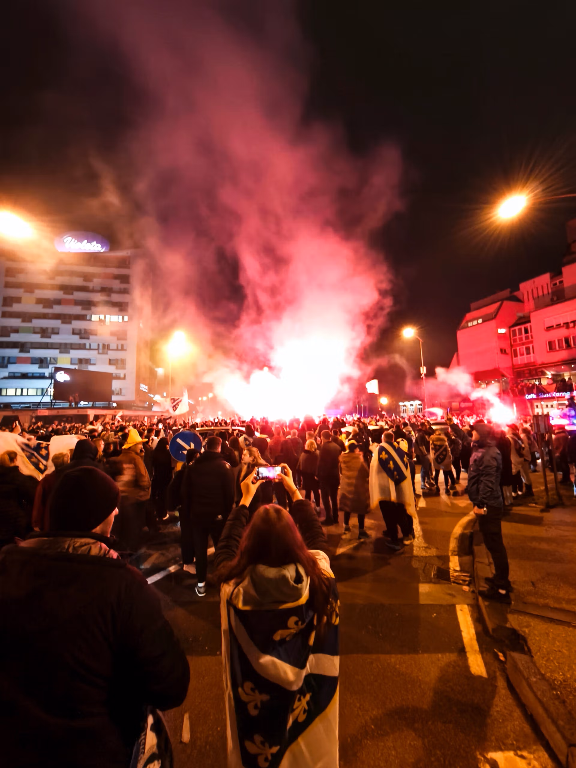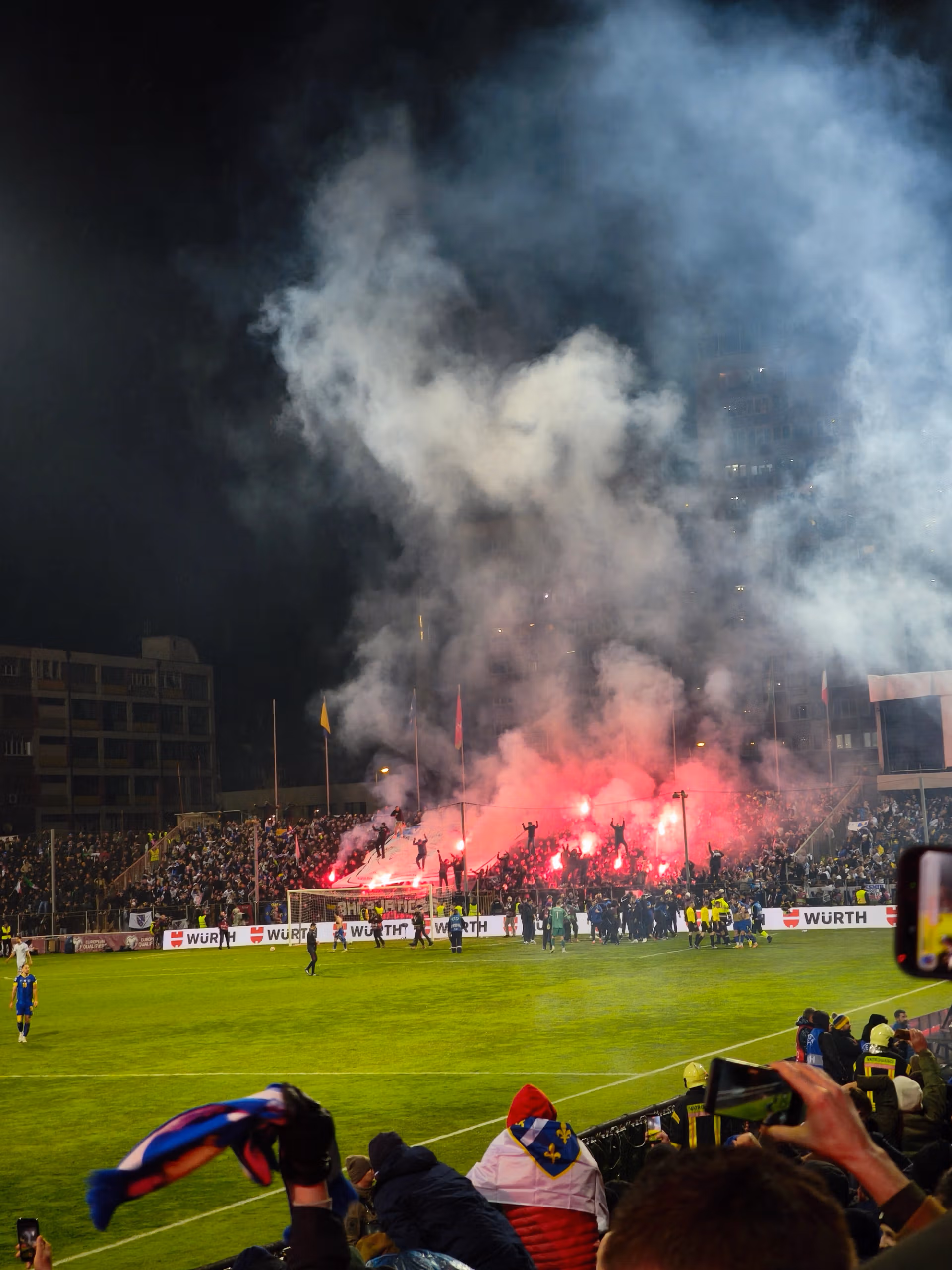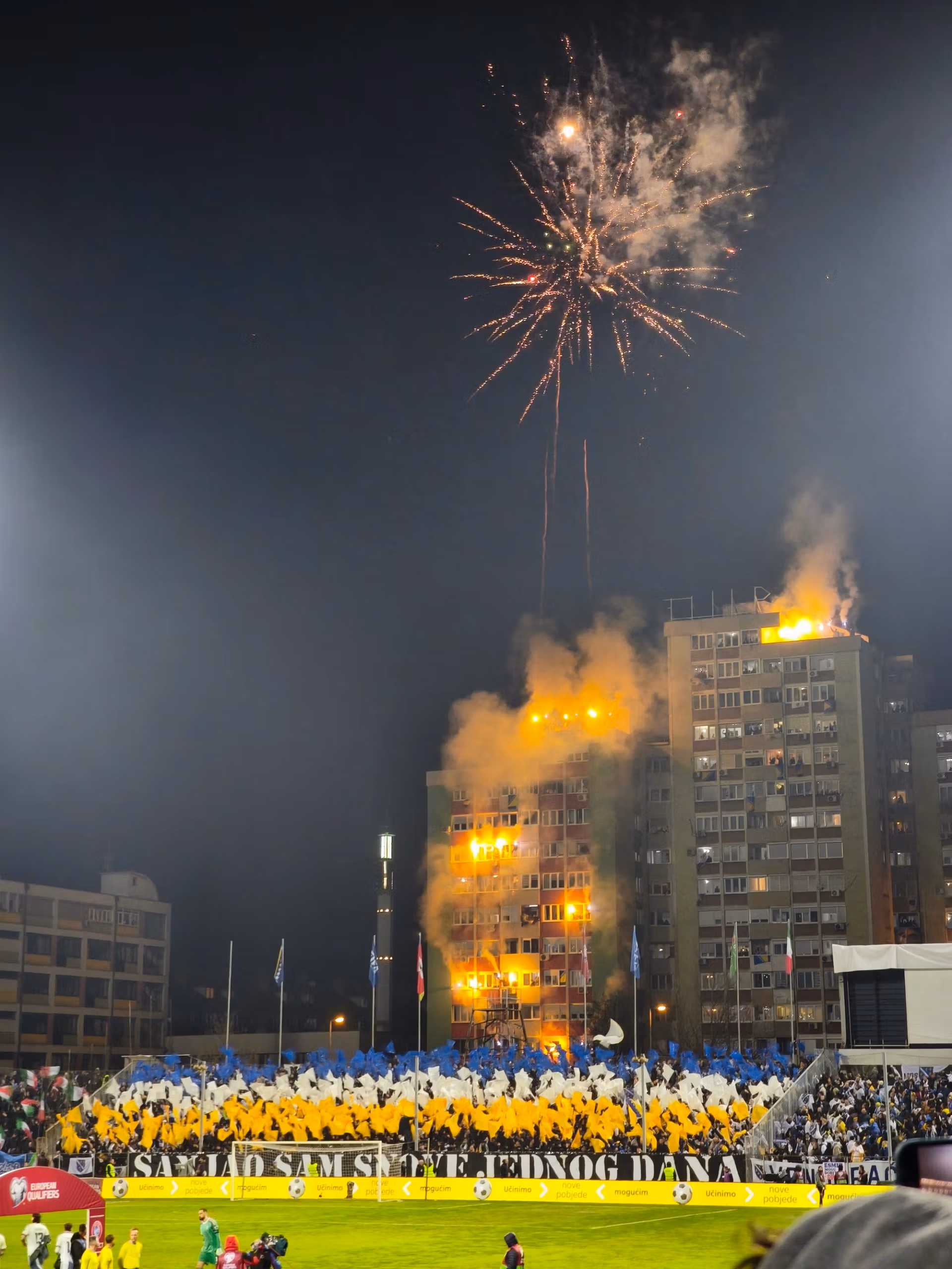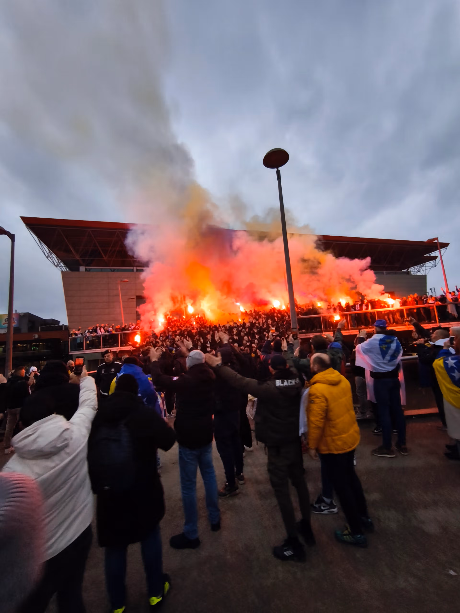 Iako smo mi kao pokret učinili sve što smo mogli da budemo nepopularni, tokom himne se čuo samo aplauz protivnika. Jedini koji je uhvaćen tokom utakmice je Dimarco, ali vrlo diskretno. Na početku utakmice, domaći navijači su priredili prekrasan prikaz, iskoristivši i dimnu bombu i vatromet sa okolnih zgrada. Postoje dijelovi s mjestima iz cijele Bosne, uključujući dva neočekivana, Banja Luku i Livno, koje je vjerovatno donijelo muslimansko stanovništvo gradova. Tu su i ultrasi iz Sandžaka, regije Srbije s bošnjačkom većinom. Jedan dio grupe Torcida se ističe od ostalih. Dva puta tokom utakmice, cijeli stadion skandira “Palestina, Palestina”.