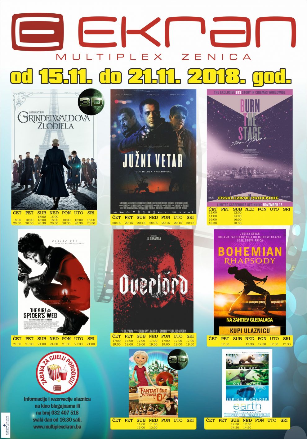 Na program Multiplexa „Ekran“ Zenica se na zahtjev gledalaca vraća i epska, biografska priča „Bohemian Rhapsody“, a film će se prikazivati u petak, nedjelju, ponedjeljak, utorak i srijedu s početkom u 17:30 sati. Također, svaki dan u terminu od 20:15 sati publika će moći pogledati i domaći krimi film „Južni vetar“, a za sve ljubitelje svijeta čarobnjaka na programu je film “Čudesne zvijeri: Grindelwaldova zlodjela”.