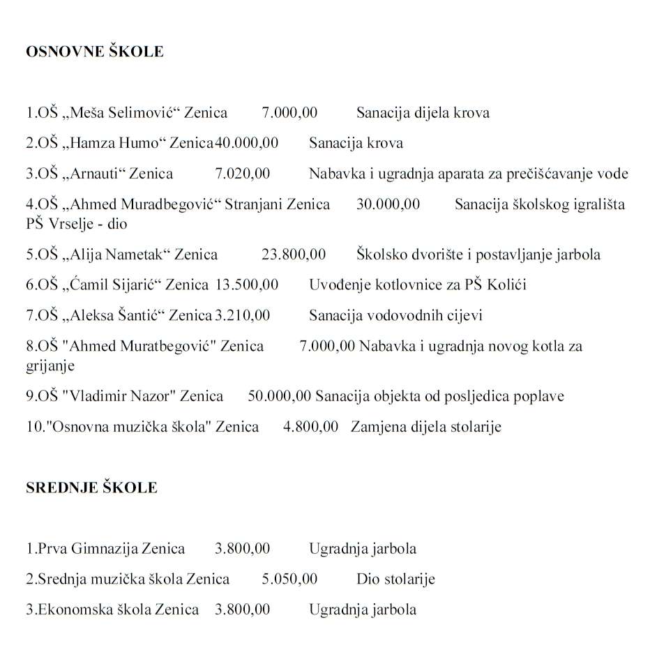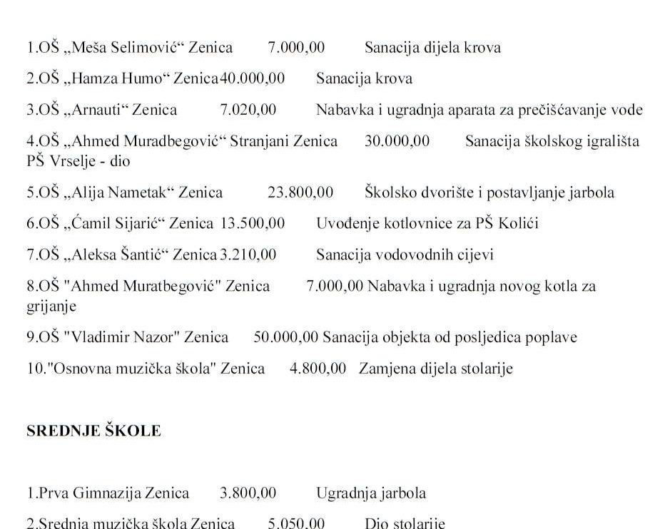 11.ZENICA OŠ „Ahmed Muradbegović“ Zenica 5.000,00 PŠ Pojske -nedostajuća sredstva za školsku ogradu
