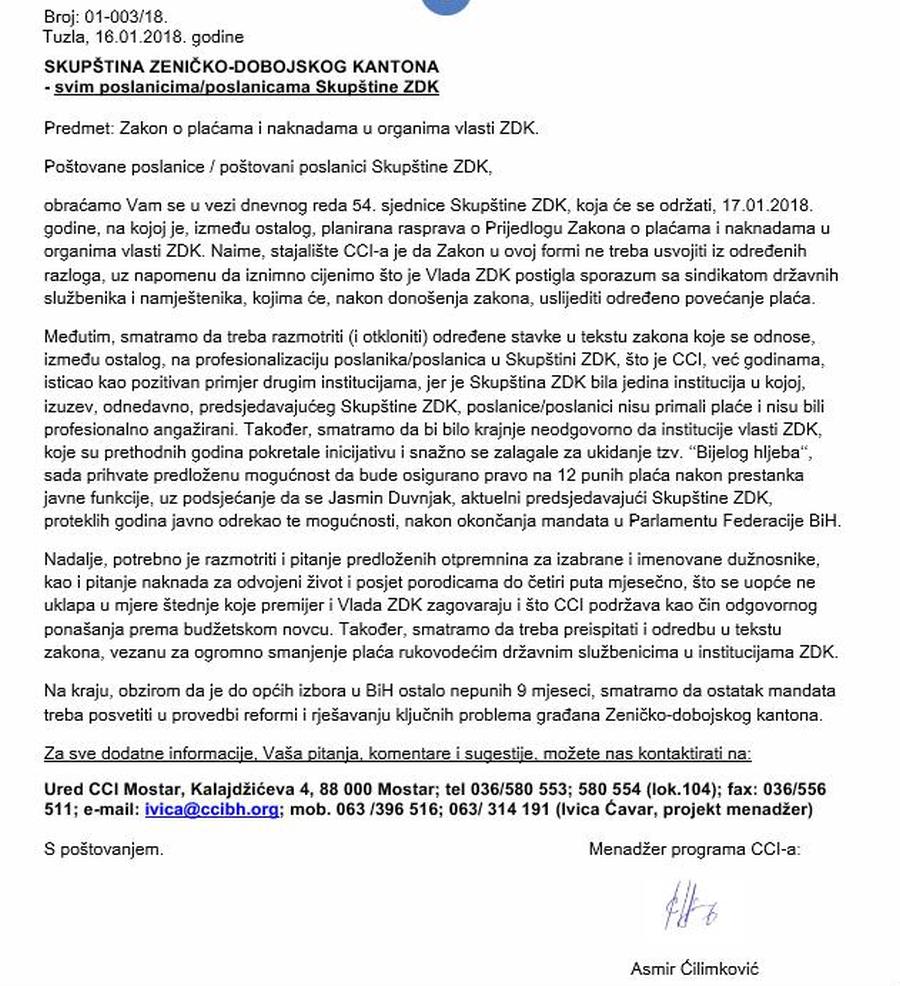 Kako saznaje Zenicablog, iz Centara civilnih inicijativa (CCI) upućeno je pismo svim zastupnicima u skupštini ZDK, kojim se traži da još jednom razmisle, te preispitaju namjeru da se pridruže kolegama u svim ostalim kantonima, dodatno opterećujući ionako “klecajući” budžet ovog kantona, i to svega nekoliko mjeseci pred izbore.