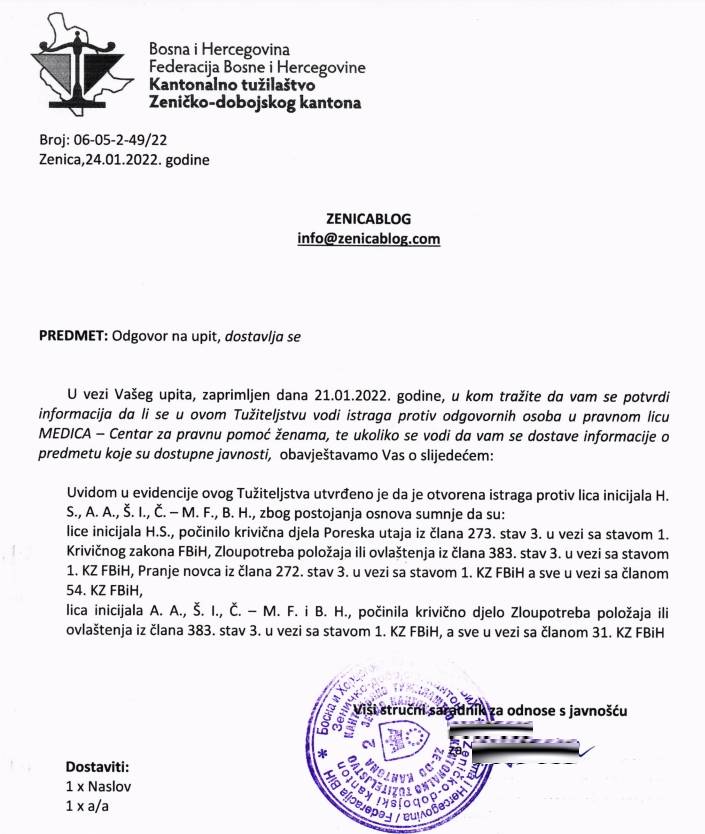 Osim nje, osumnjičene su još četiri osobe, članice Nadzornog odbora “Medice”, Amira Alijagić, Irma Šiljak, Fatima Čajlaković-Mešanović i Hava Brandić. Njih se tereti za saučiniteljstvo u Zloupotrebi položaja.