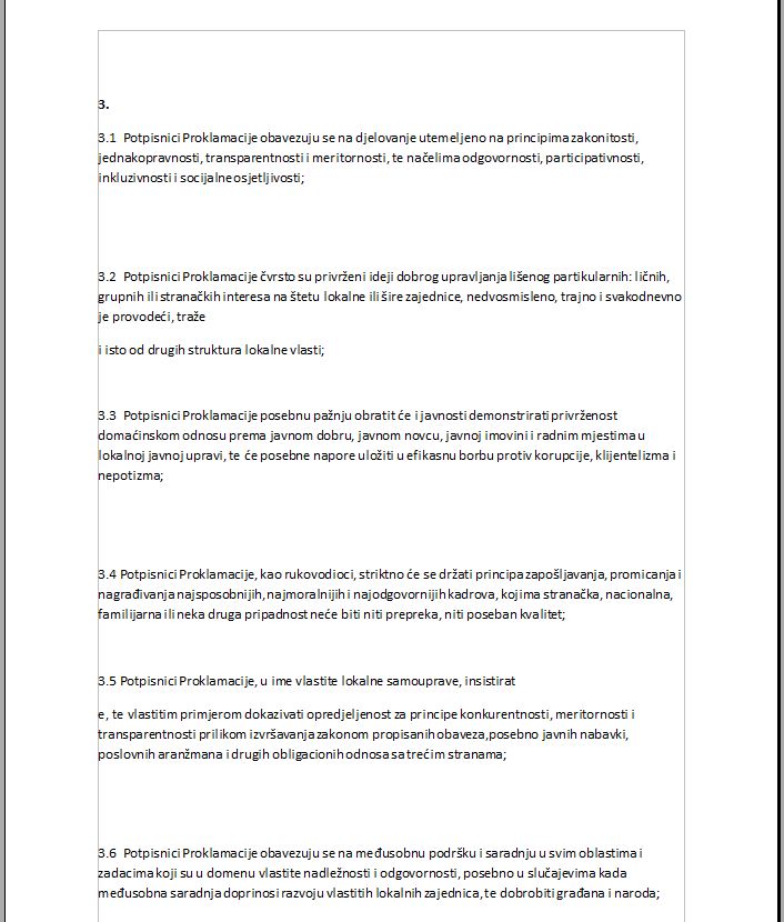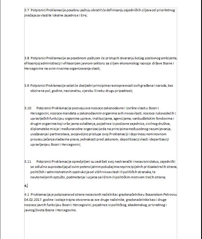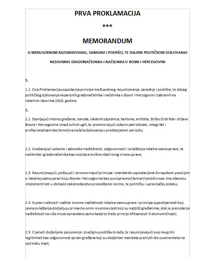Između ostalog, u proklamaciji se navodi da su potpisnici opredijeljeni zadržati svoj nestranački i nezavisni status, zajednički se odlučno suprotstaviti svim potencijalnim pokušajima neprincipijelnih pritisaka trećih strana, političkih i administrativnih opstrukcija od viših nivoa vlasti i političkih stranaka, te neutemeljnih optužbi, podmetanja i ucjena sa ličnim i političkim motivom trećih strana.