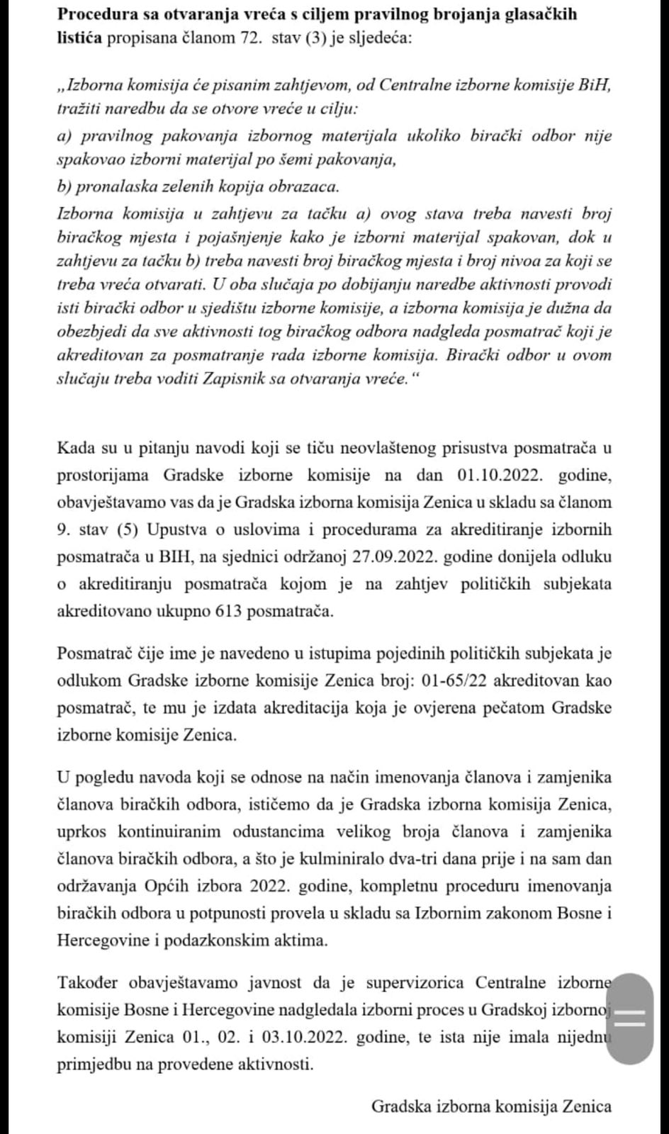 Također obavještavamo javnost da je supervizorica Centralne izbom komisije Bosne i Hercegovine nadgledala izborni proces u Gradskoj izborn komisiji Zenica 01., 02. i 03.10.2022. godine, te ista nije imala nijedn primjedbu na provedene aktivnosti.