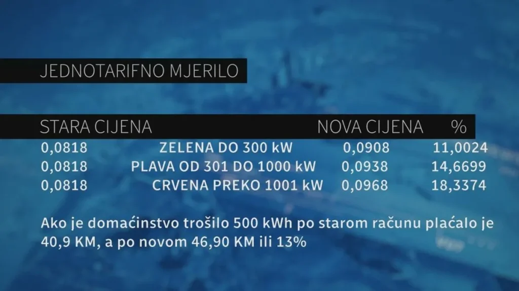 Na istom mjerilu oni koji troše od 300 do 1000 kilovat-sati plaćat će 14,66 posto više, a oni koji troše preko 1000 kilovat-sati struje mjesečno, plaćat će 18,33 posto više. U principu ako je domaćinstvo trošilo 500 kilovat-sati električne energije po starom računu plaćalo je 40,9 maraka, a po novom 46,9 maraka ili 13 posto više.