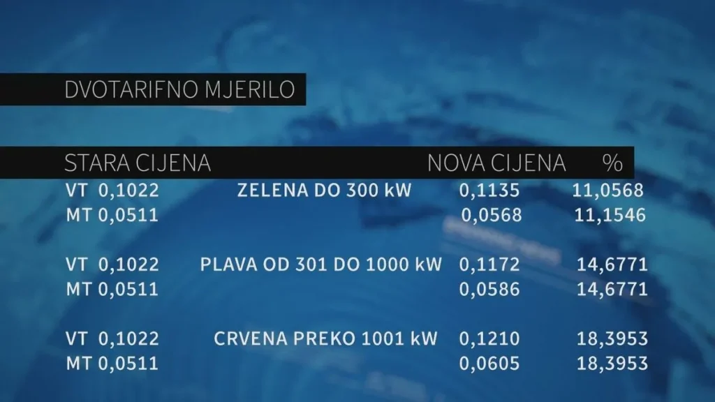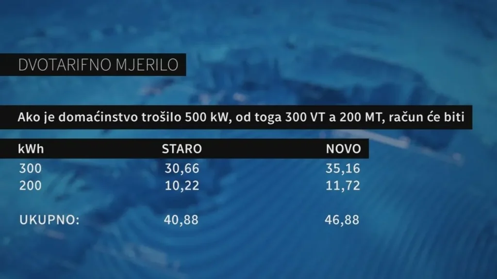 Kod dvotarifnog mjerila stara cijena za visoku tarifu za one koji troše do 300 kilovat-sati mjesečno bila je 0,1022 KM, nova cijena je 0,1135, što je povećanje od preko 11 posto za malu tarifu stara cijena je 0,0511 KM, a nova 0,0568 ili povećanje od 11,1 posto.