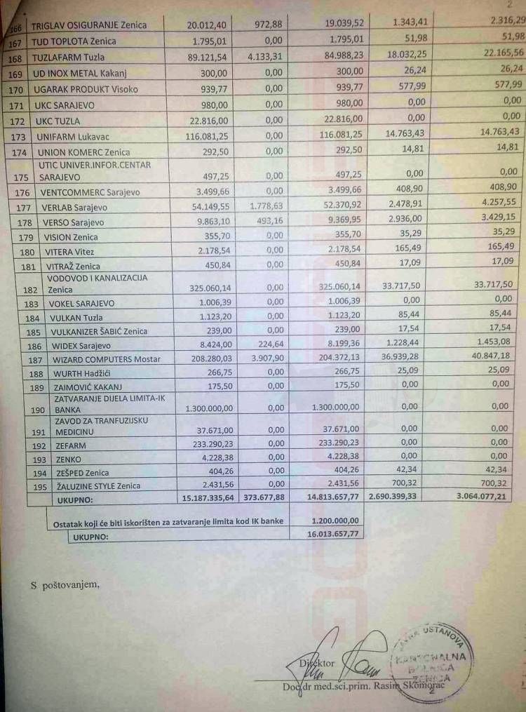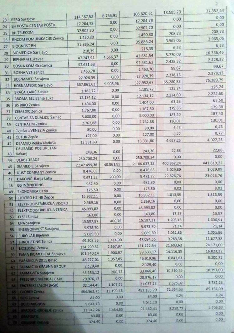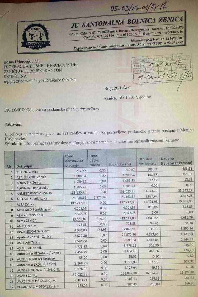 Ekskluzivno: pogledajte spisak dobavljača, isplaćenih dugovanja Kantonalne bolnice, otpisanih zateznih kamata…. – Zenicablog vam donosi spisak svih onih kojima je Kantonalna bolnica Zenica isplatila dugovanja/potraživanja, iz sredstava kreditnog zaduženja od 16 miliona KM. Zastupnik u Kantonalnoj skupštini Munib Husejnagić zatražio je ove podatke, a odgovor je, u ime institucije koju predvodi, dostavio direktor KBZ Rasim Skomorac. Pogledajte.