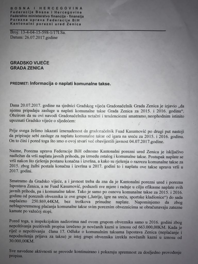 EKSKLUZIVNO: Porezna uprava FBiH demantuje navode gradonačelnika Kasumovića – Kako Zenicablog ekskluzivno saznaje, iz Kantonalnog ureda Porezne uprave Federacije u Zenici na adresu Gradske uprave Zenica stiglo je oštro intonirano i pismo zanimljive sadržine, u kojem se demantuju navodi gradonačelnika Fuada Kasumovića kojima on aebi i Upravi pripisuje zasluge za naplatu duga za takse od kladioničara.