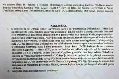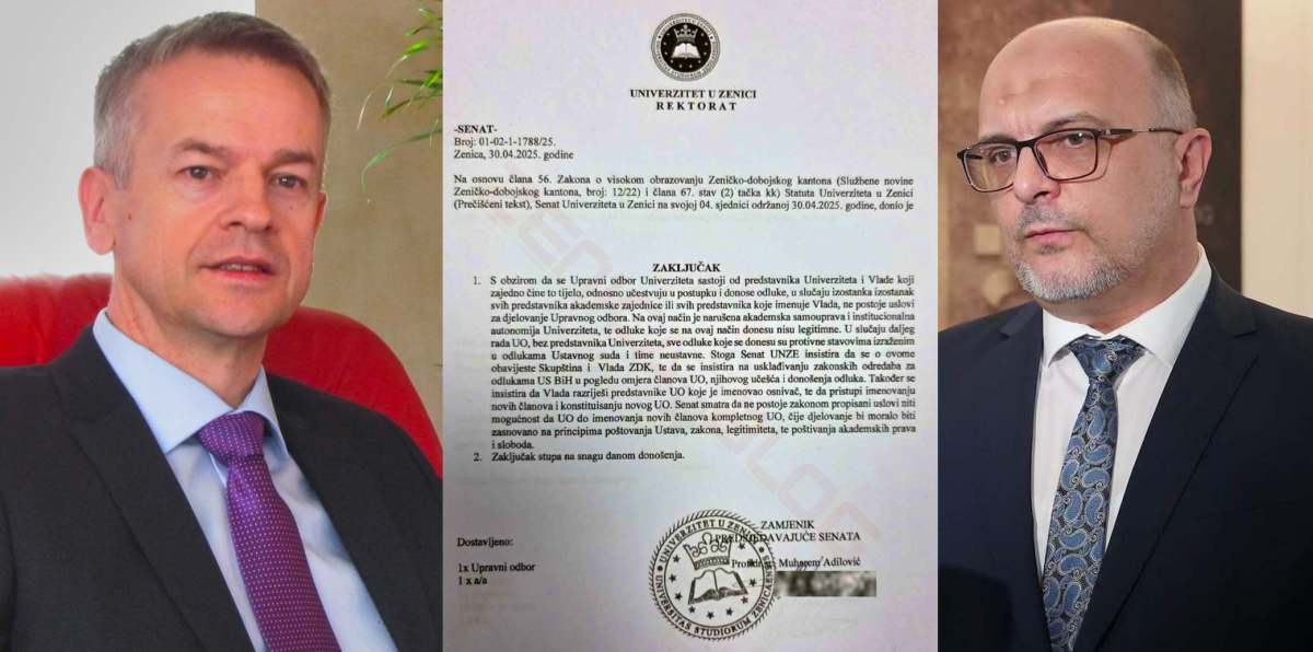 Senat Univerziteta u Zenici posljednjeg aprilskog dana je na svojoj sjednici većinom glasova donio Zaključak, kojim Upravni odbor ove visokoškolske ustanove proglašava “nelegitimnim” i tražio njegovu smjenu.