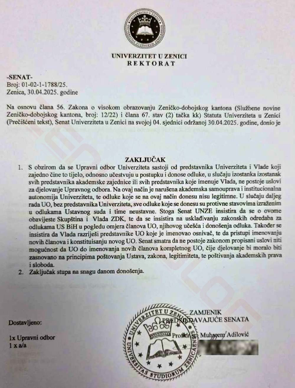 Upoznat sam sa Zaključkom Senata JU Univerzitet u Zenici, broj: 01-02-1-1788/25 od 30. 4. 2025. godine. Iz navedenog Zaključka Senata JU Univerzitet u Zenici, nedvosmisleno se mogu utvrditi sljedeće činjenice: