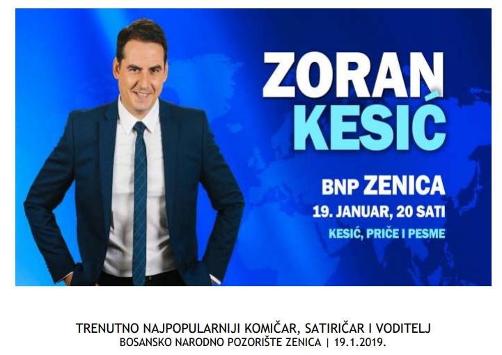 EKSKLUZIVNO – ZORAN KESIĆ: Fudbal i Čelik su mi prva asocijacija na Zenicu, moj nastup u Zenici biće jak kao čelik, ko preživi dva sata mog nastupa… Zoran Kesić (rođen u Beogradu, 26. jul 1976) je srbijanski TV voditelj, novinar i autor popularnih humorističkih emisija “Ozbiljne vesti”, “Dezinformator”, “Fajront republika” i “24 minuta sa Zoranom Kesićem” koja se emituje od 2013. godine na televiziji O2 (do 11. septembra 2017. Televizija B92).