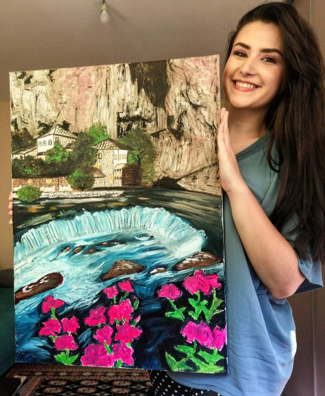 -„Slikam pejzaže, mrtvu prirodu, apstraktne motive itd. Najviše volim apstraktnu umjetnost ali slikam i crtam po narudžbi odnosno po želji kupca. Sva ova umjetnost me čini opuštenom i sretnom osobom. Kroz to izražavam sebe i tu ostavljam dio sebe. Svaka slika je rađena sa velikom ljubavlju“ – rekla je Emina čije radove možete pogledati na Facebook stranici Emina slike i crteži https://www.facebook.com/eminacrtezi/