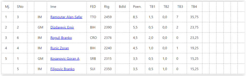 Pobjednik turnira je internacionalni majstor (IM) Ramoutar Alan-Safar (Trinidad i Tobago) sa 8,5 poena, drugo mjesto pripalo je Zeničaninu, velemajstoru (GM) Emiru Dizdareviću sa 5,5 poena, a treće IM Branku Rogulju (Hrvatska) sa 4,5 poena. Ovo su ujedno i trojica novčano nagrađenih igrača sa 500, 300 i 200 KM.