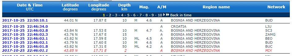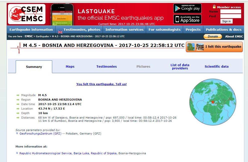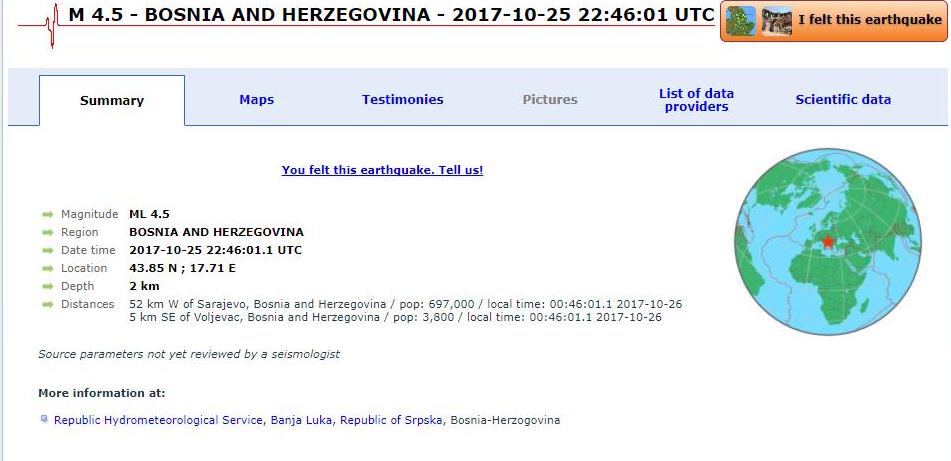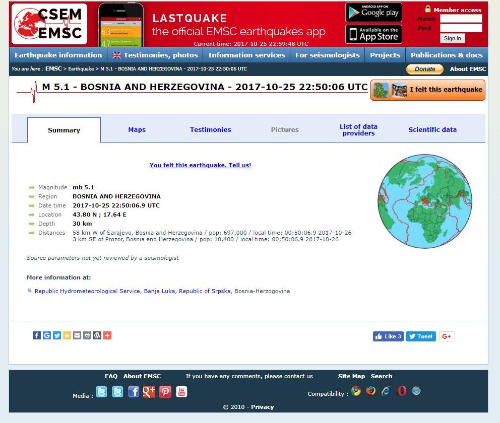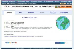 EMSC: u prvom satu četvrtka zabilježena tri zemljotresa, 46, 50 i 58 minuta nakon ponoći – U tri navrata, 46, 50 i 58 minuta nakon ponoći, u prvom satu četvrtka seizmološki uređaji u BiH su zabilježili zemljotrese srednje jačine. Iako su se oba zemljotresa osjetila u Zenici, njihovi epicentri, prema EMSC sajtu koji bilježi sve zemljotrese širom svijeta, nisu bili blizu Zenice, nego znatno zapadnije. Pogledajte podatke koje smo preuzeli sa ovog sajta.
