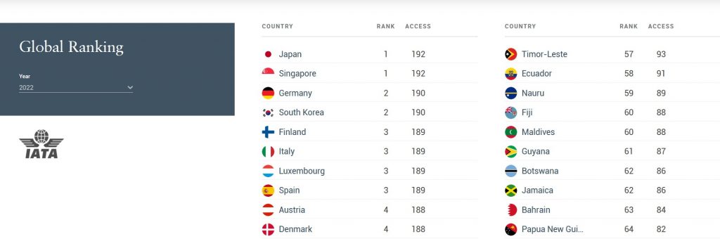Prvo mjesto ove liste dijele Japan i Singapur sa po 192 zemlje u koje njihovi državljani mogu slobodno da putuju. Zato su pasoši ove dvije države danas ocijenjeni kao najmoćniji na svijetu.