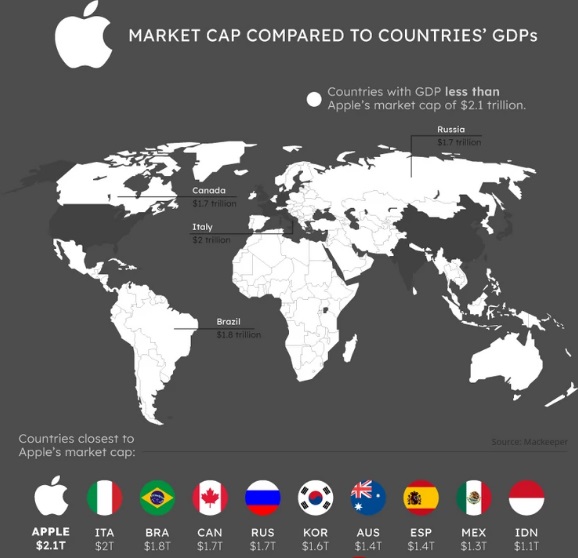 Da je država, Apple bi se najverovatnije nalazio u G7. Tržišna kapitalizacija, veća od 2,1 biliona dolara, Applea je veća od BDP-a 96 posto zemalja u svijetu. Samo 7 država ima veći BDP od vrednosti Applea, prenosi Blic.