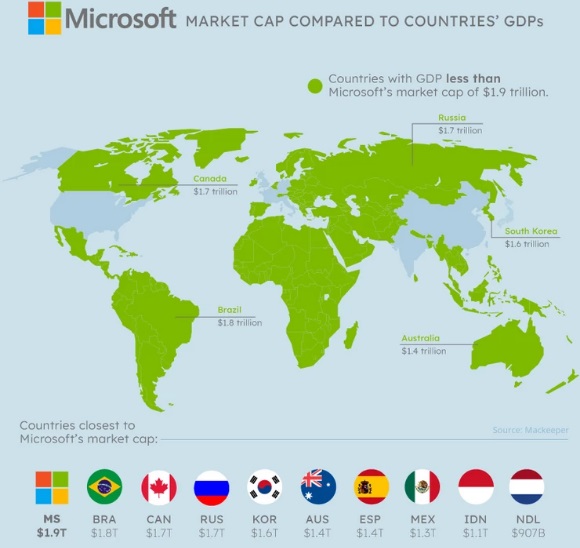 Sa tržišnom vrijednošću od 1,9 biliona, Microsoft bi se, u slučaju da je zemlja, nalazio na 10. mjestu, ispred Brazila, Kanade, Rusije i Južne Koreje.