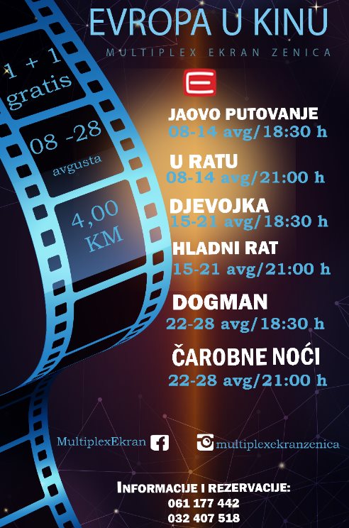 Multiplex “Ekran” Zenica će u periodu od 08. do 28. avgusta realizovati aktivnost “Evropa u kinu”, reviju koja za cilj ima promociju i projekcije nekih od najboljih evropskih filmova u prošloj godini. Osim kvalitetnog programa u kojem će publika uživati u dva termina dnevno, organizatori su se pobrinuli da cijene ulaznica za reviju budu na simboličnoj razini, pa će tako publika po cijeni jedne ulaznice od 4,00 KM drugu ulaznicu dobiti gratis.
