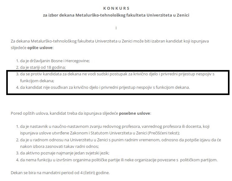 Faktor je u svom tekstu od ponedjeljka objavio tekst konkursa za tu poziciju, a koji je i dalje javno dostupan na stranici Univerziteta, u kojem se, između ostalog, navodi da je jedan od uvjeta konkursa i taj “da da se protiv kandidata za dekana ne vodi sudski postupak za krivično djelo i privredni prijestup nespojiv s funkcijom dekana”.