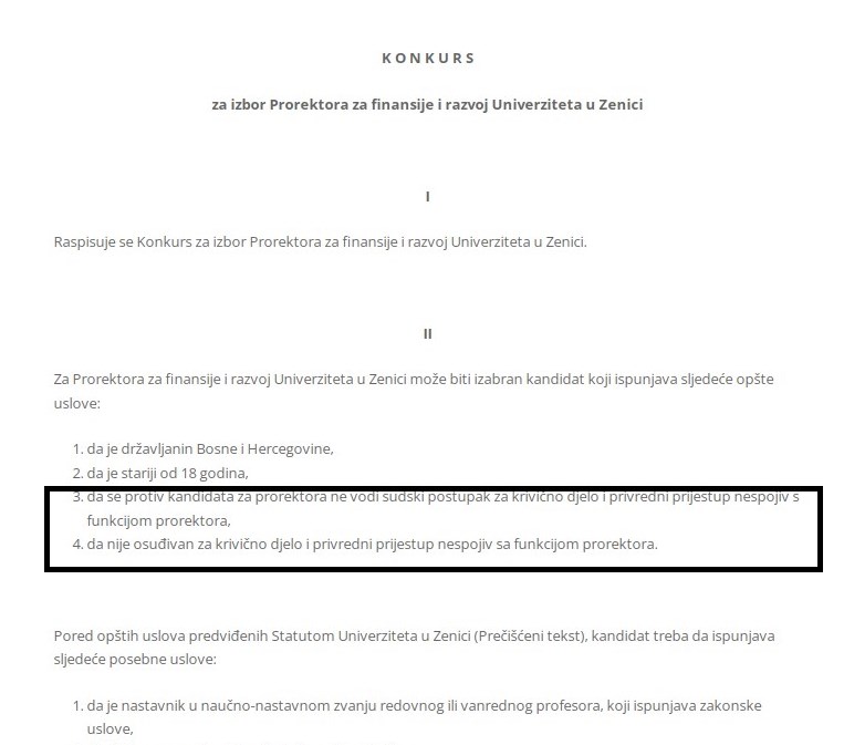 I ovaj konkurs je javno dostupan na stranici Univerziteta i u njemu se također, kao jedan od uvjeta navodi i “da se protiv kandidata za prorektora ne vodi sudski postupak za krivično djelo i privredni prijestup nespojiv s funkcijom prorektora, da nije osuđivan za krivično djelo i privredni prijestup nespojiv sa funkcijom prorektora”.