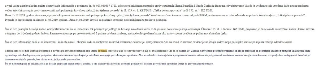 Faktor je u svom ranijem tekstu objavio odgovor Općinskog suda u Bugojnu u kojem je navedeno da su Bušatlić, kao i suoptuženi u tom slučaju, u oktobru 2018. godine osuđeni na novčane kazne zbog krivičnog djela nanošenje lakših tjelesnih povreda, da je ta kazna postala pravosnažna u martu 2019. godine, kao i da su optuženi u aprilu iste godine izvršili plaćanje izrečenih kazni. Također nam je potvrđeno da izrečene sankcije nisu brisane iz evidencije i da su tek nedavno podneseni zahtjevi za to, nakon što su se ispunili zakonski uvjeti.