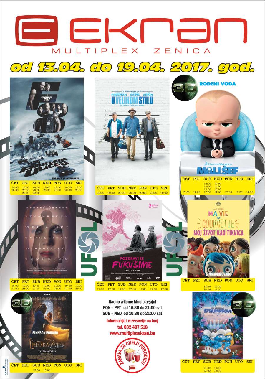 Family Centar Ekran prikazuje: premijerno od 13. do 19. aprila – Sedmicu udranih naslova predvodi pretpremijerna projekcija dugo očekivane žestoke akcije “PAKLENE ULICE 8”, komedija koja će vas nasmijati do suza “U VELIKOM STILU”, animirana komedija “MALI ŠEF (3D)” i nevjerovatna drama “POZDRAV IZ FUKUŠIME” od 13. aprila na programu Multiplexa Ekran Zenica