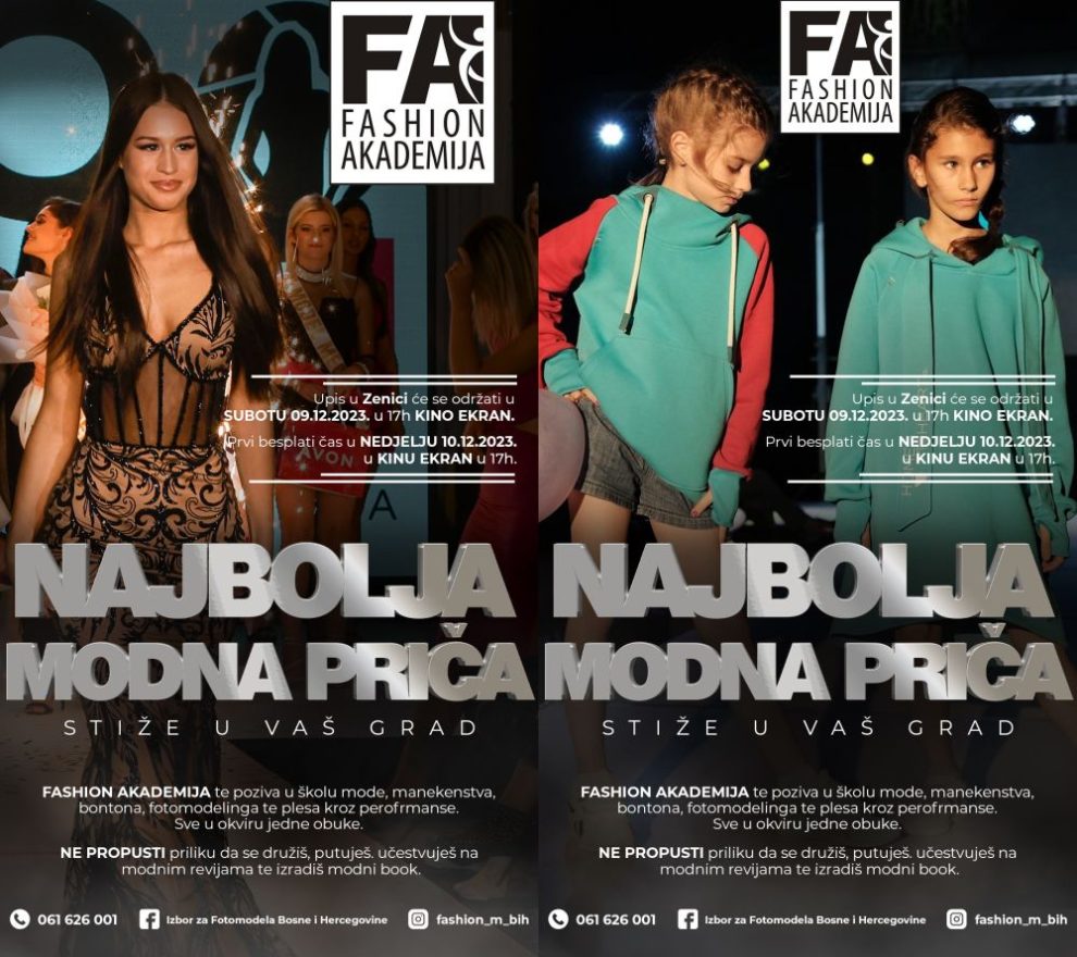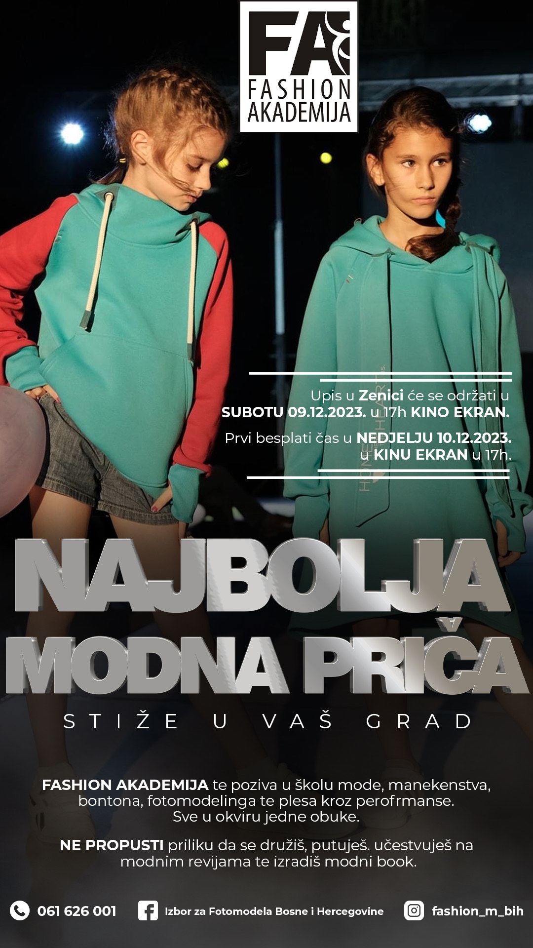 Projekat Fashion akademija postoji vec 22 godine u našem gradu i sutra u 17 h u Kinu Ekran organizira veliki upis u školu mode,manekenstva, bontona, fotomodelinga, te plesa kroz performanse.