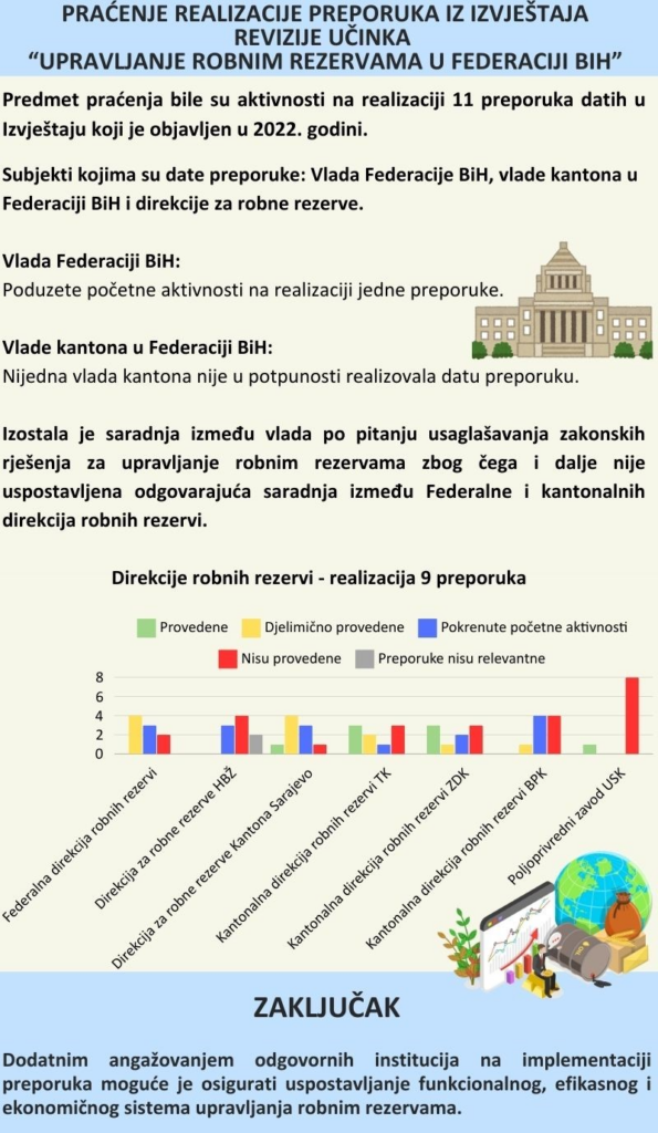 Ured za reviziju institucija u Federaciji Bosne i Hercegovine proveo je praćenje realizacije preporuka iz Izvještaja revizije učinka “Upravljanje robnim rezervama u Federaciji BiH”, objavljenog 2022. godine. Cilj je bio ispitati preduzete aktivnosti i procijeniti u kojoj mjeri su date preporuke realizovane.