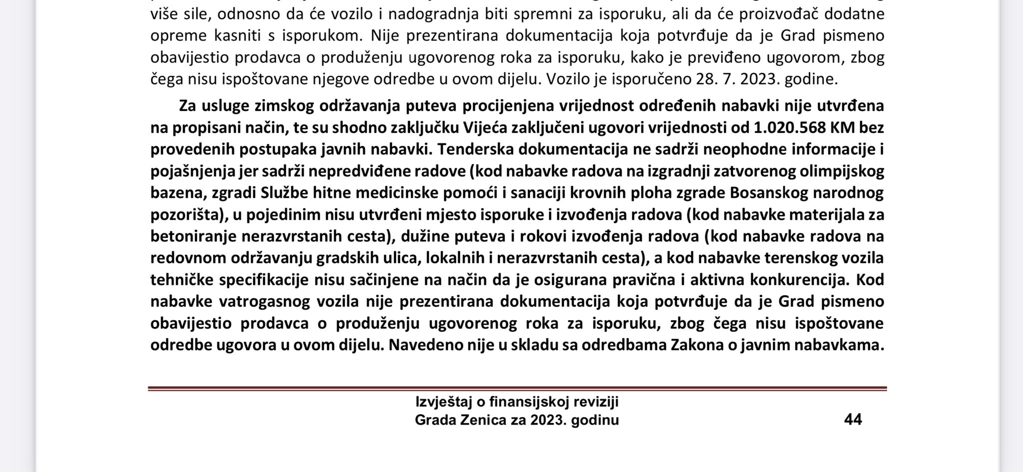 Revizori navode da za usluge zimskog održavanja puteva procijenjena vrijednost određenih nabavki nije utvrđena na propisani način, te su shodno zaključku Vijeća zaključeni ugovori vrijednosti od 1.020.568 KM bez provedenih postupaka javnih nabavki.