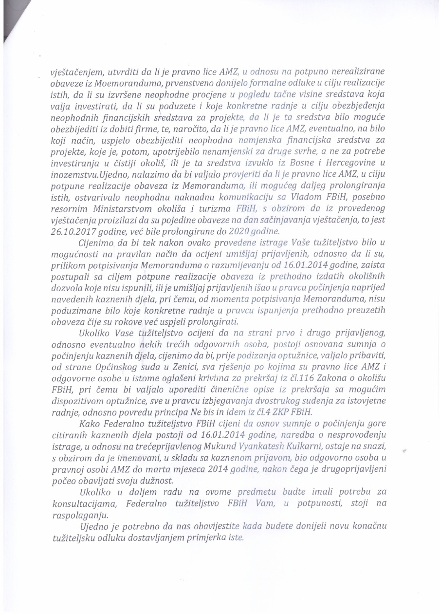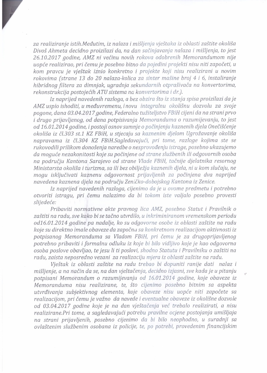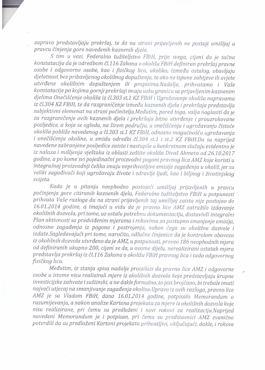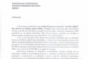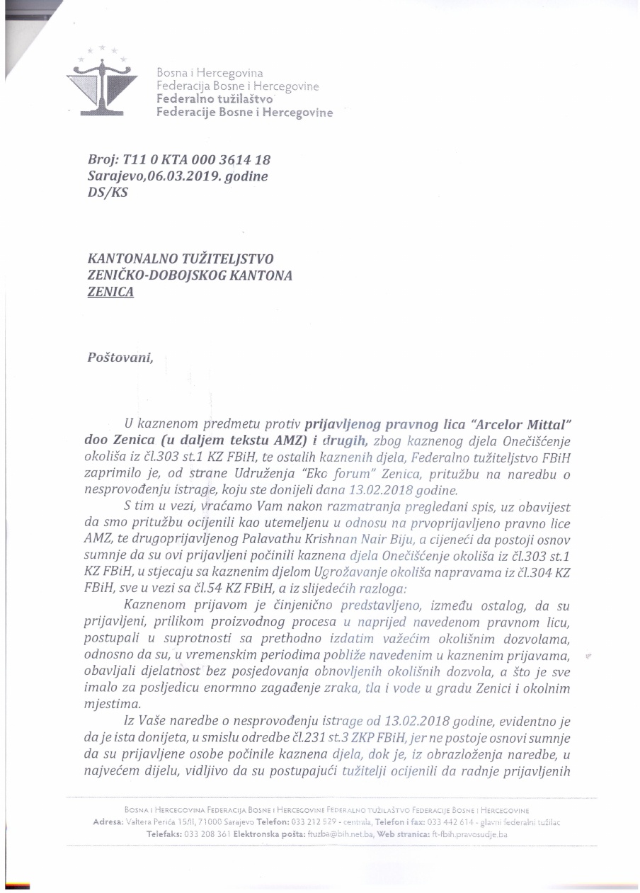Federalno tužilaštvo naložilo da se ponovno pokrene istraga po prijavi Eko foruma – Federalno tužilaštvo donijelo je 6.3.2019 odluku da se prihvati pritužba Eko foruma na naredbu kantonalnog tužilaštva ZDK o neprovođenju istrage od 9.4.2018. Odlukom Federalnog tužilaštva traži se od kantonalnog tužilaštva ZDK da ponovo provede istragu o prijavljenim kaznenim djelima iz članova 303 i 304 Krivičnog zakona FBiH protiv odgovornih osoba iz kompanije ArcelorMittal Zenica.