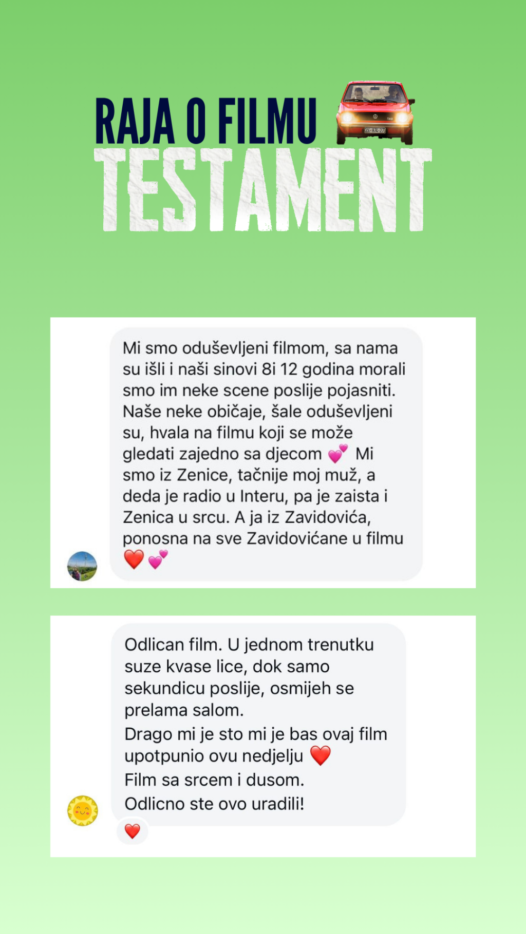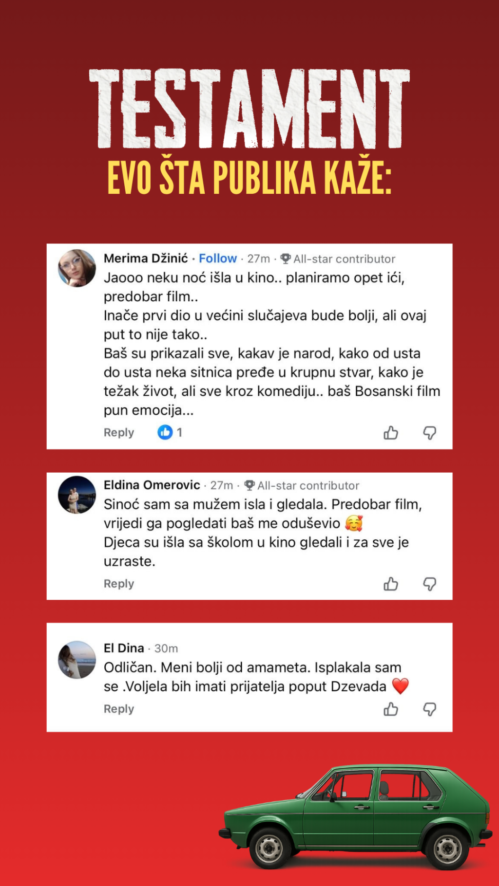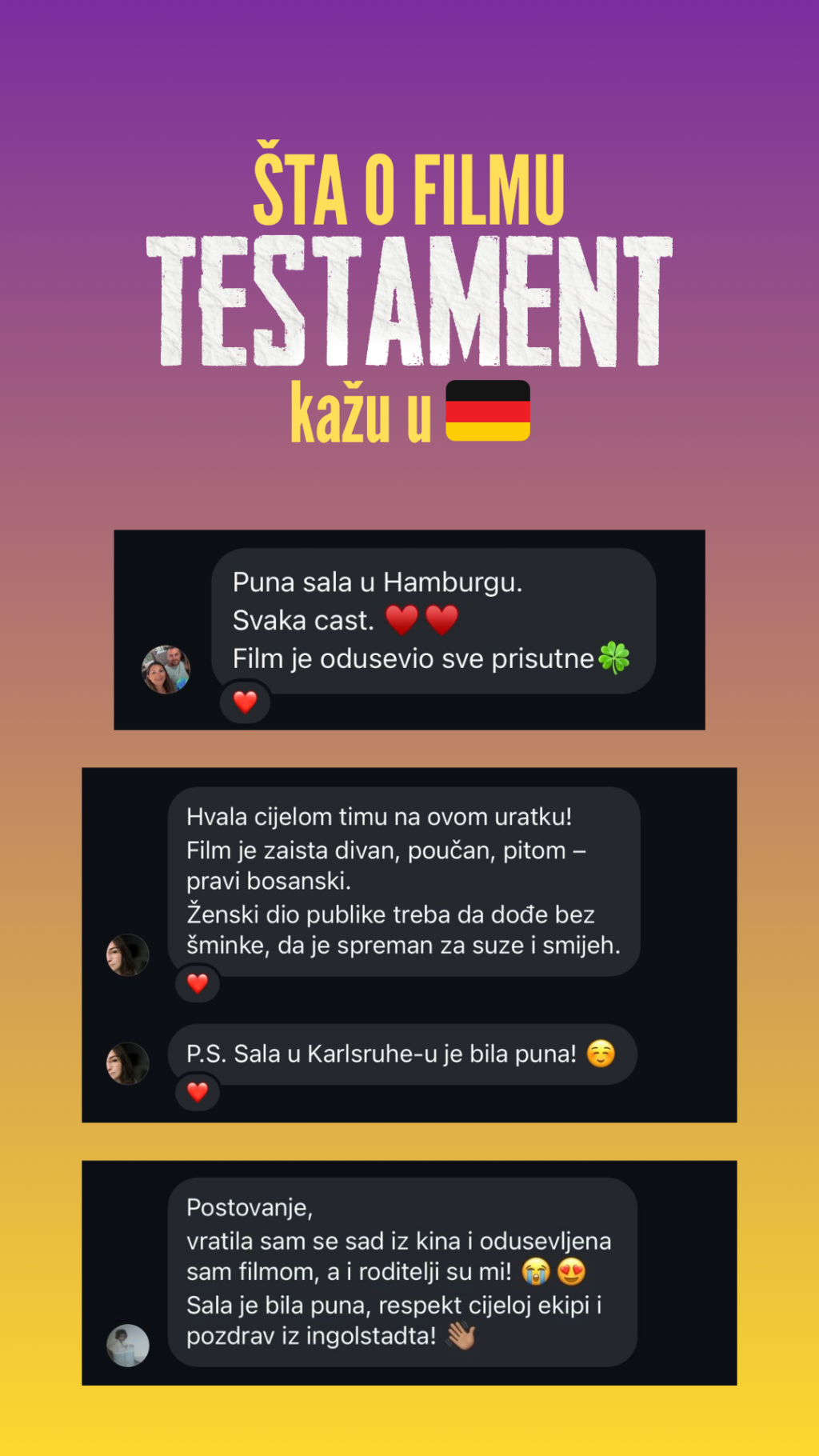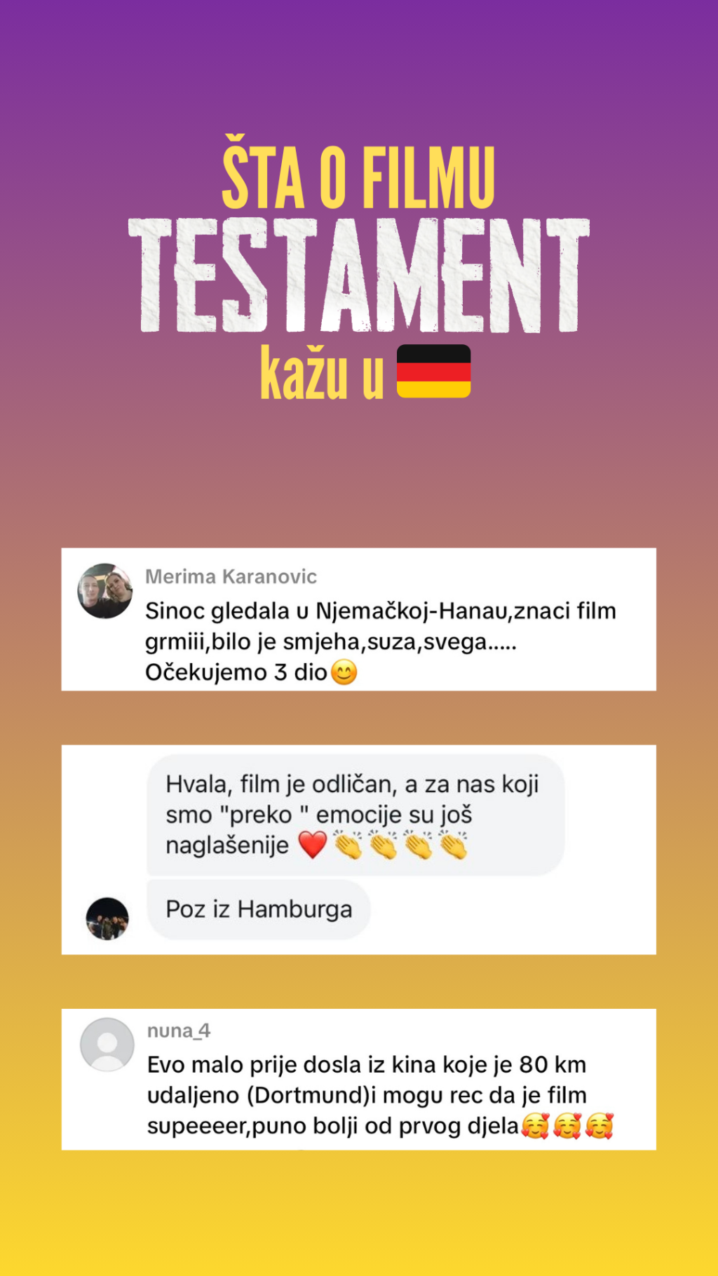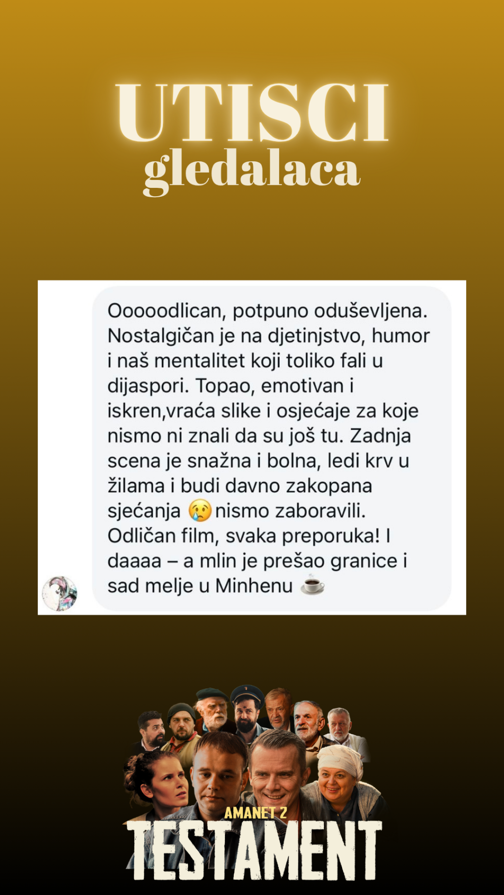 Domaći igrani film „Testament – Amanet 2“ je za samo 12 dana od premijere pogledalo preko 50.000 gledalaca u kinima širom Bosne i Hercegovine i Evrope.