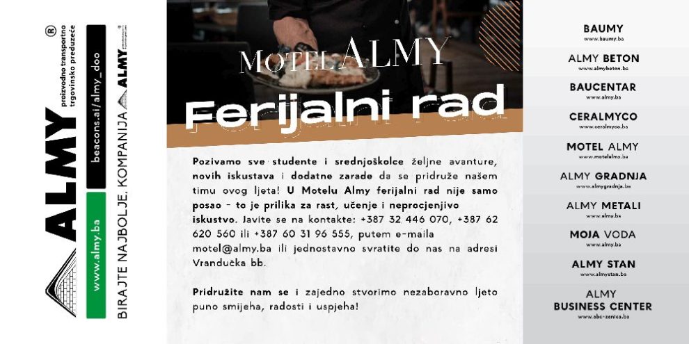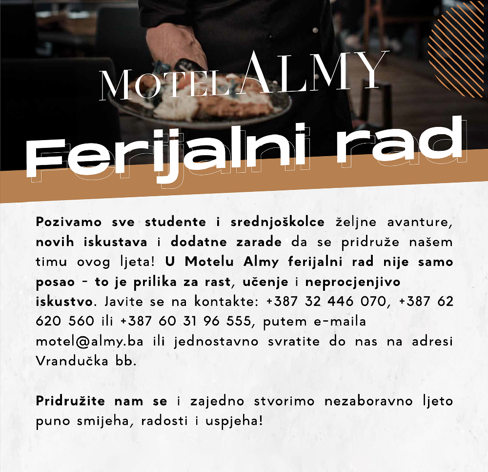 Pozivamo sve studente i srednjoškolce željne avanture, novih iskustava i dodatne zarade da se pridruže našem timu ovog ljeta! U Motelu Almy ferijalni rad nije samo posao – to je prilika za rast, učenje i neprocjenjivo iskustvo. Javite se na kontakte: +387 32 446 070, +387 62 620 560 ili +387 60 31 96 555, putem e-maila [email protected] ili jednostavno svratite do nas na adresi Vrandučka bb.