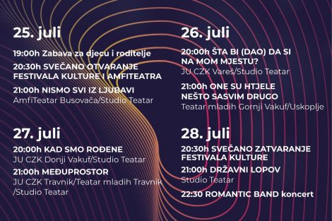 Imajući u vidu da su u protekla četiri mjeseca producirane četiri omladinske predstave u okviru navedenoga projekta, Festival kulture će biti prilika da publika sve predstave pogleda na jednom mjestu, ali da uživa i drugim kulturno – umjetničkim programima. Festival počinje programom za djecu i roditelje, u nedjelju od 19:00 sati, a već od 21:00 sat na programu je predstava „Nismo svi iz ljubavi“, nastala u produkciji Studio Teatra i AmfiTeatra Busovača. Nakon predstave publika će uživati u svirci prvog uličnog benda u BiH „Argus flomb“.