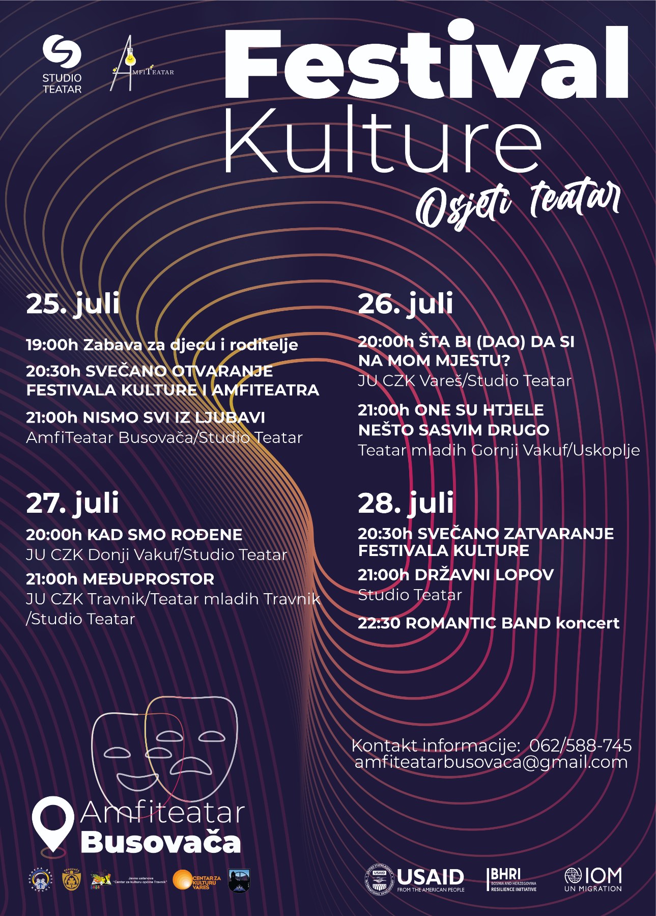 U okviru projekta Osjeti Teatar, koji realizuje Studio Teatar sa svojim partnerima AmfiTeatrom Busovača, Osnovnom školom Kaćuni, centrima za kulturu Travnik, Donji Vakuf i Vareš, u nedjelju u Busovači, 25. jula, počinje prvi Festival kulture koji će trajati do srijede, 28. jula.
