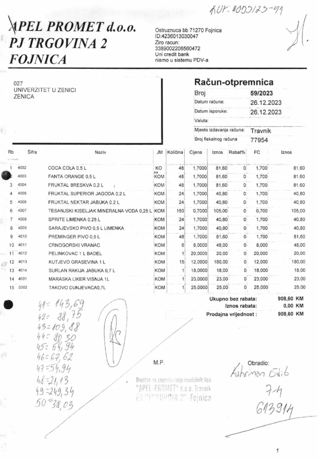 A, rastrošnosti je bilo i bahaćenju od strane univerzitetskog menadžmenta, a koje najbolje ilustruju računi u čijem smo posjedu. Naime, firma Apel promet d.o.o. PJ Trgovina 2 Fojnica ispostavila je zeničkom Univerzitetu račun za isporučeno piće, sokove i vodu, ali i pivo, vino te žestoka pića u vrijednosti od 908,60 KM!