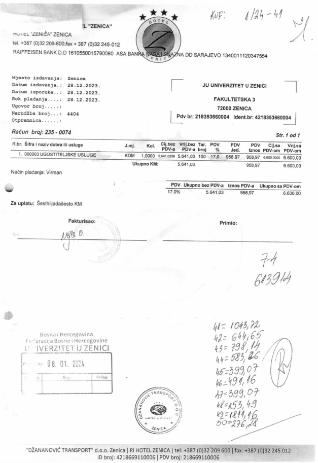 Još jedan račun je sporan. Jedan zenički hotel je ovom Univerzitetu ispostavio račun na iznos od 6.600 KM za pružene ugostiteljske usluge, a radi se o novogodišnjoj fešti koju je Univerzitet organizovao za svoje zaposlenike.
