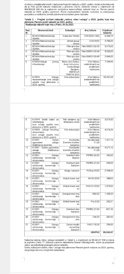 Pojednostavljeno, nabavljeni radovi, robe i usluge nisu planirane Planom javnih nabavki za 2023. godinu, zbog čega nisu mogle biti ni nabavljeni. To je očito jasno svima koji poznaju zakone, ali ne i “finansijski autonomnom” menadžmentu Univerziteta u Zenici.