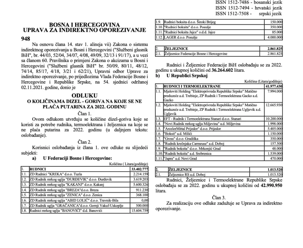 Utvrđeno je da su spomenutom odlukom UO UIO rudnici u FBiH oslobođeni plaćanja putarine na dizel-goriva u 2022. godini na količinu od 33.402.777 litara, odnosno u iznosu od 13.361.110,80 KM. Rudnici i termoelektrane u RS oslobođeni su na količinu od 41.977.430 litara, odnosno u iznosu od 16.790.972 KM.