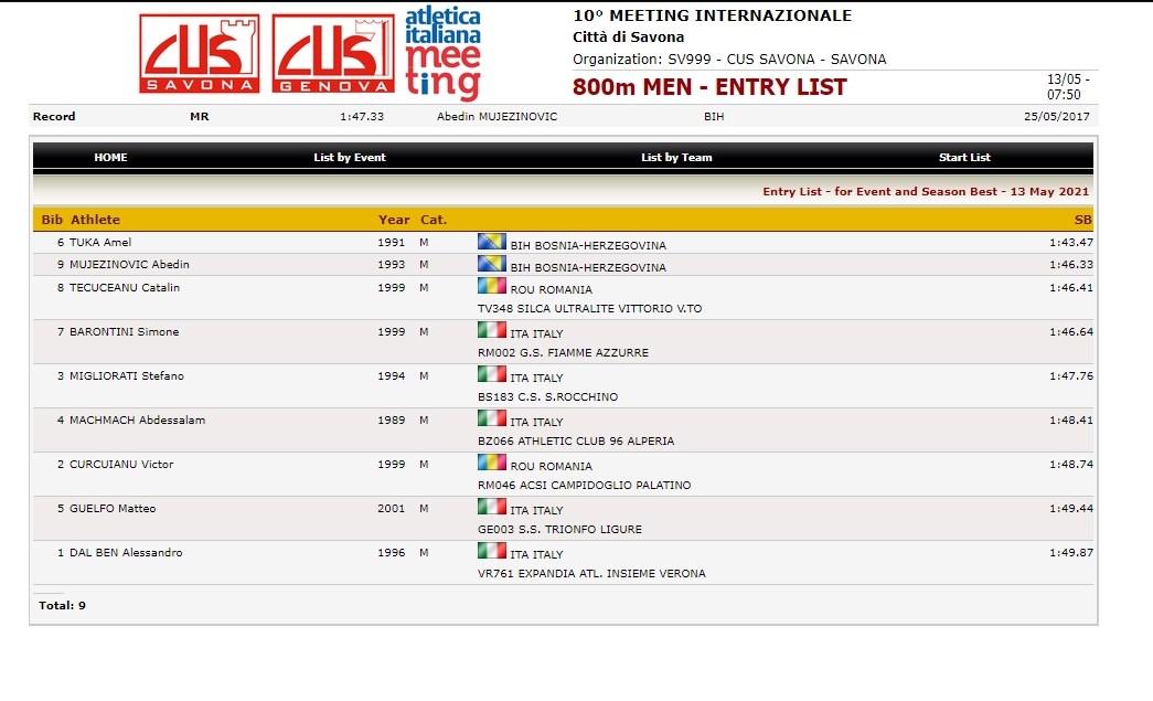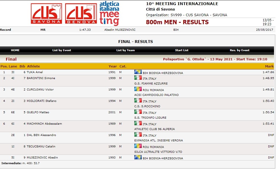 Naš sugrađanin Amel Tuka je večeras na otvaranju sezone osvojio prvo mjesto u utrci na 800 metara u Savoni (Italija) na 10. Međunarodnom mitingu Grada Savona. On je trku na 800 metara istrčao vremenom 1:47.86. Zanimljivo je da rekord ove staze i dalje, već četiri godine, drži Abedin mujezinović, sa vremenom 1.47.31. Abedin je trčao i večeras (19.10 sati po našem vremenu) trku u Savoni, ali je nije završio.
