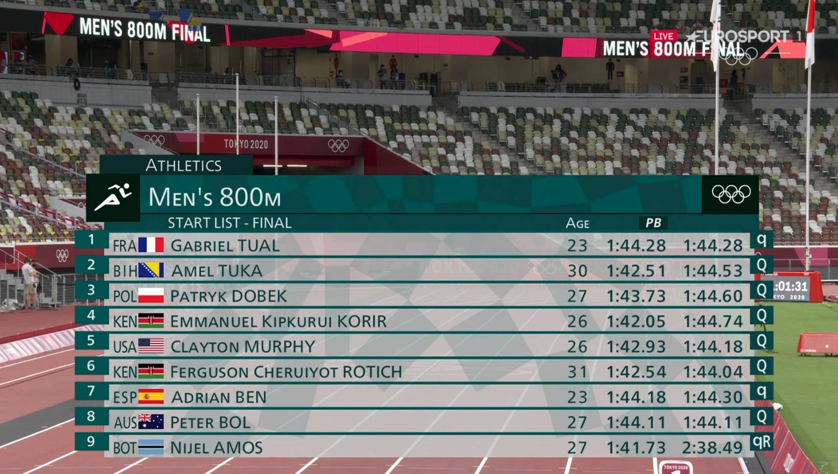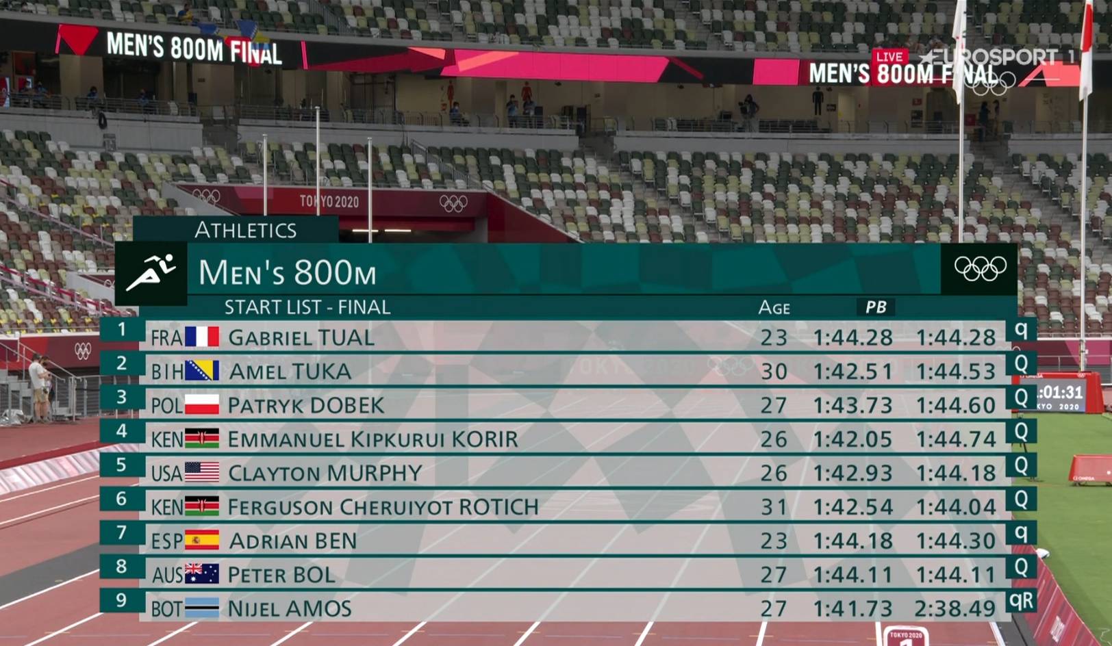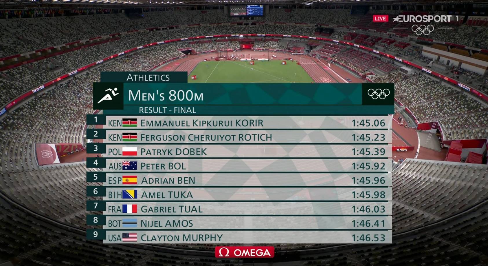 Najbolji bh. atletičar Amel Tuka (30) osvojio je šesto mjesto u finalu utrke na 800 metara na Olimpijskim igrama u Tokiju. Amel je dobro otvorio trku, na početku je držao korak za vodećim, no nakon 400 metara izgubio je korak za vodećim i tek u finišu uspio je popraviti svoju poziciju i doći do šeste pozicije. Emmanuel Korir iz Kenije je osvojio zlatnu medalju s vremenom 1:45.06, na drugom mjestu završio je njegov sunarodnjak Ferguson Rotich, koji je trčao 1:45.23. Na trećem mjestu završio je senzacionalni Patryk Dobek (1:45.39), a naš Amel je utrku završio na šestom mjestu s vremenom 1:45.98.