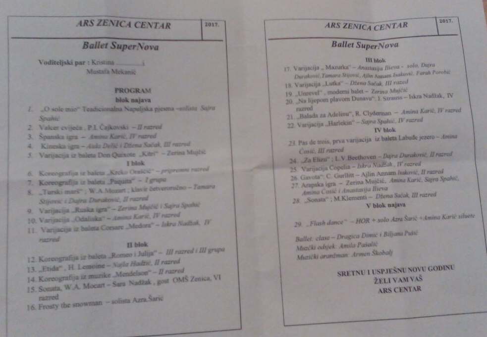 Na velikoj sceni Bosanskog narodnog pozorišta Zenica, uokviru Cabaret Winter Festa (CWF), održan je nesvakidašnji spektakl, baletno-muzički performans ARS Centra Zenica. U pet blokova sa 29 tačaka programa, u kojima su pored balerina svih grupa i uzrasta nastupili i muzičari, igrači i mnogo gostiju iznenađenja publika je sa oduševljenjem pratila program i uživala u čaroliji “zvjezdica”. I ova, kao i svaka druga noć CWF-a je posvećena osobama sa posebnim potrebama, koje će biti dio ove zimske priče, iz Udruženja roditelja osoba sa posebnim potrebama “Zvijezda” Zenica.