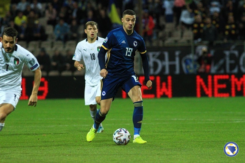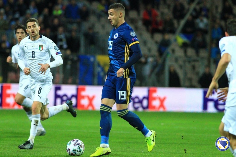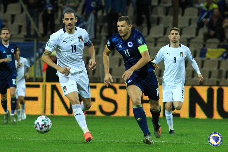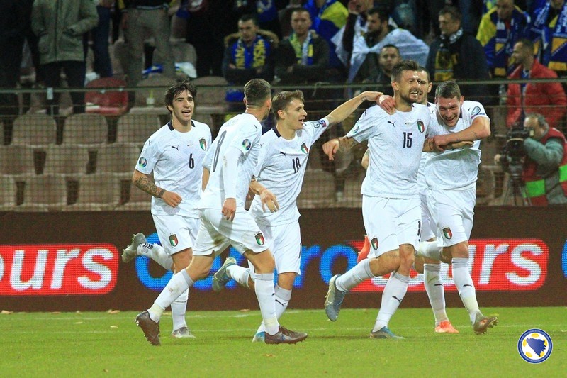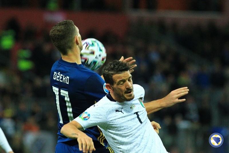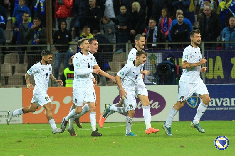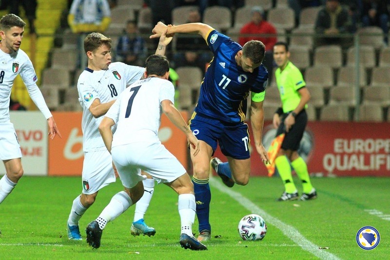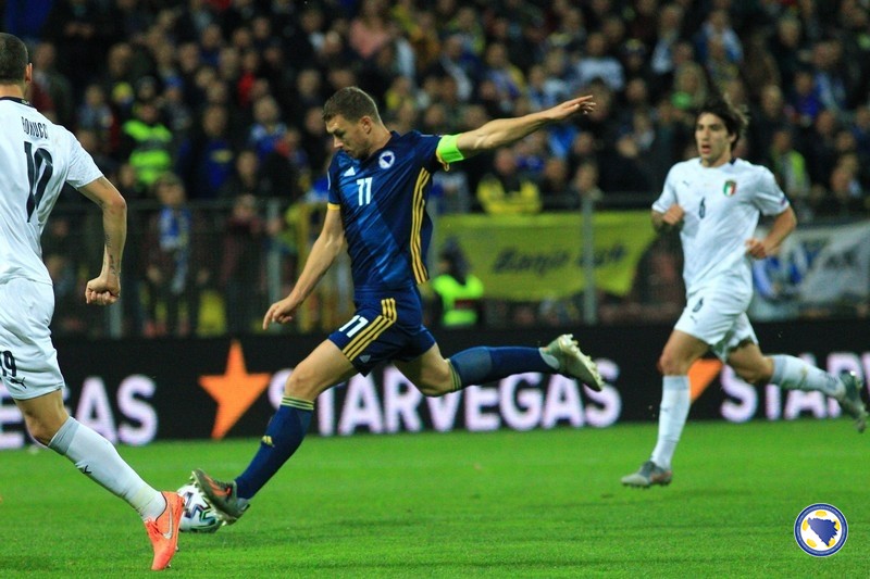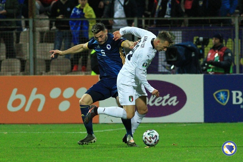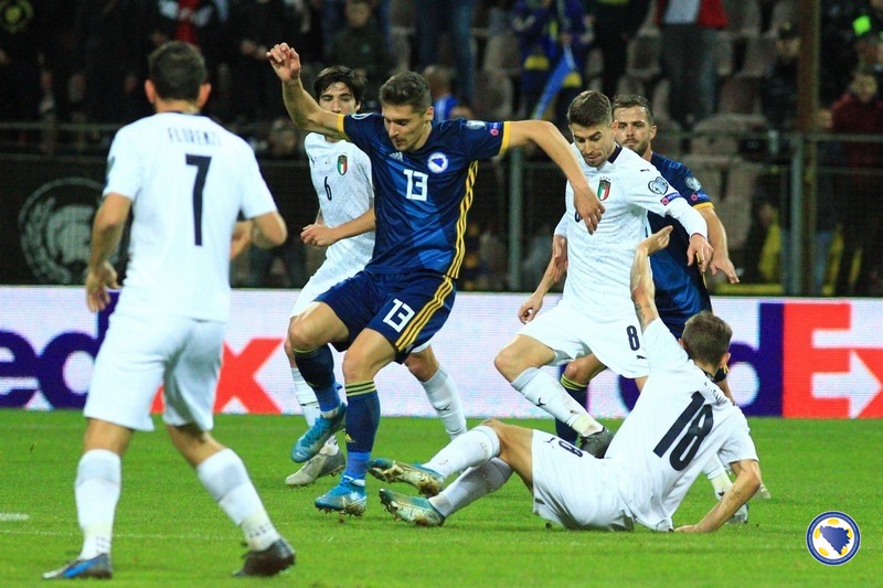A“ reprezentacija Bosne i Hercegovine poražena je večeras na „Bilinom polju“ u Zenici od Italije sa 0:3 u svom pretposljednjem susretu kvalifikacija za Euro 2020. – Miralem Pjanić u 8′ centrira iz kornera, a najviši u skoku bio je Ermin Bičakčić čiji šut glavom brani Gianluigi Donnarumma. Italija u 21′ izvodi odličnu akciju koju završava Francesco Acerbi preciznim udarcem sa desetak metara za 0:1. Muhamed Bešić je imao dobar pokušaj u 31′, ali je Emerson na gol-liniji izblokirao njegov udarac. Pokušao je i Edin Džeko u 33′, ali je Donnarumma još jednom dobro intervenisao. Gosti udvostručuju prednost u 37′. Lorenzo Insigne ulazi u kazneni prostor bh. tima i iskosa sa desne strane šalje loptu u mrežu.