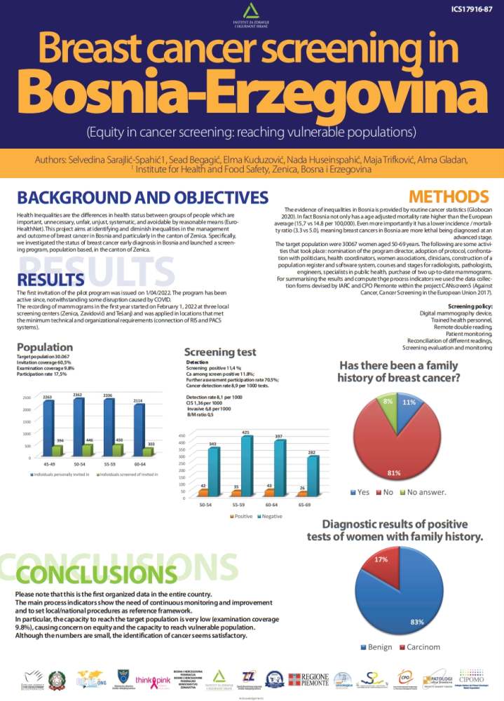 Zahvaljujući provođenju projekta “Od svjesnosti do liječenja: Žene glavni nosioci prava na zdravlje u BiH”, koju uz pomoć italijanskih partnera provodi Institut za zdravlje i sigurnost hrane Zenica (INZ), Bosna i Hercegovina se po prvi put našla na globalnoj planetarnoj mapi država u kojima se provodi organizovani mamografski skrining program.