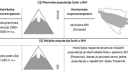 Bosanska šarka – Vipera berus bosniensis Boettger, 1880. Adultne jedinke gotovo da jedva dostižu 60cm. Spolni domorfizam je također uočljiv u obojenosti jedinki: mužjak je siv ili smeđe boje sa crnom (u pravilu isprekidanom) šarom, dok su ženke smeđe ili crvenakste sa manje izraženom smeđom šarom. Pojava melanizma je vrlo česta kod ove vrste u BiH (kao termoregulaciona adapatacija) i važno je napomenuti da se crne zmije trebaju tretirati kao forme, a ne kao (pod)vrste. Šarka je također viviparna vrsta, a ženka rađa od 3 do 15 mladunaca. Rasprostranjenje šarke u BiH je neobično. Nizijske populacije naseljavaju šumske predjele i rubove starih očuvanih šuma Posavine. S obzirom da su ovakvi ekosistemi u BiH vrlo rijetki, nizijske populacije su ekstremno fragmentirane i kritično ugrožene. Trenutno je poznata samo jedna takva populacija u zapadnoj Posavini. S druge strane, visokoplaninske populacije naseljavaju uglavnom alpske livade (iznad granice šume), pa su prirodno fragmentirane (kao da se nalaze na posebnim otocima). Još uvijek nije poznato da li se na svim bosanskohercegovačkim planinama nalaze populacije šarki, ali su poznate sa slijedećih: Cincar, Dinara, Čvrsnica, Zelengora, Lelija, Maglić, Bjelašnica, Igman, Treskavica, Vran, Vlašić, Vranica. Šarka ne naseljava mediteranski dio Hercegovine. Iako se mogu naći zajedno, šarka nerado dijeli stanište sa poskokom zbog kompeticije za prostor i hranu. Ujed šarke je bolan, ali smrtni slučajevi su ekstremno rijetki (npr. u slučaju povrede glavnog krvnog suda).