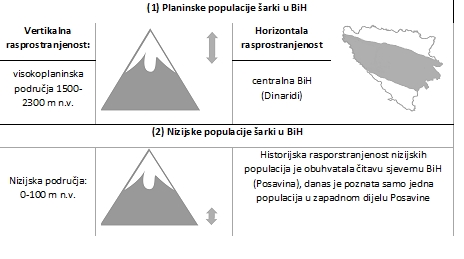 Bosanska šarka – Vipera berus bosniensis Boettger, 1880. Adultne jedinke gotovo da jedva dostižu 60cm. Spolni domorfizam je također uočljiv u obojenosti jedinki: mužjak je siv ili smeđe boje sa crnom (u pravilu isprekidanom) šarom, dok su ženke smeđe ili crvenakste sa manje izraženom smeđom šarom. Pojava melanizma je vrlo česta kod ove vrste u BiH (kao termoregulaciona adapatacija) i važno je napomenuti da se crne zmije trebaju tretirati kao forme, a ne kao (pod)vrste. Šarka je također viviparna vrsta, a ženka rađa od 3 do 15 mladunaca. Rasprostranjenje šarke u BiH je neobično. Nizijske populacije naseljavaju šumske predjele i rubove starih očuvanih šuma Posavine. S obzirom da su ovakvi ekosistemi u BiH vrlo rijetki, nizijske populacije su ekstremno fragmentirane i kritično ugrožene. Trenutno je poznata samo jedna takva populacija u zapadnoj Posavini. S druge strane, visokoplaninske populacije naseljavaju uglavnom alpske livade (iznad granice šume), pa su prirodno fragmentirane (kao da se nalaze na posebnim otocima). Još uvijek nije poznato da li se na svim bosanskohercegovačkim planinama nalaze populacije šarki, ali su poznate sa slijedećih: Cincar, Dinara, Čvrsnica, Zelengora, Lelija, Maglić, Bjelašnica, Igman, Treskavica, Vran, Vlašić, Vranica. Šarka ne naseljava mediteranski dio Hercegovine. Iako se mogu naći zajedno, šarka nerado dijeli stanište sa poskokom zbog kompeticije za prostor i hranu. Ujed šarke je bolan, ali smrtni slučajevi su ekstremno rijetki (npr. u slučaju povrede glavnog krvnog suda).