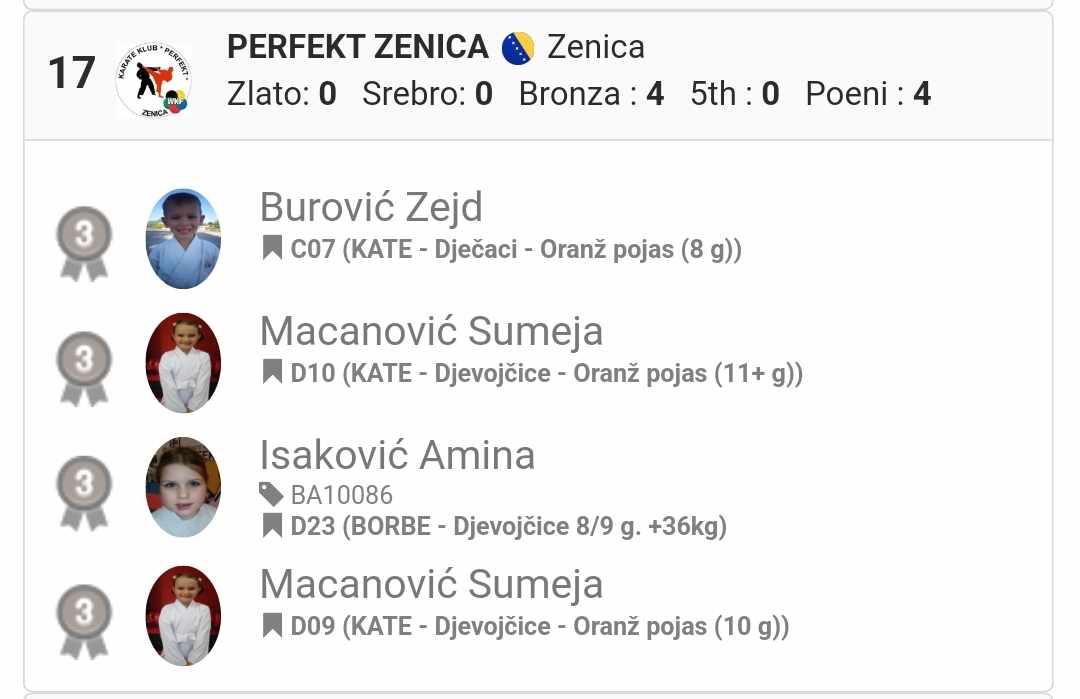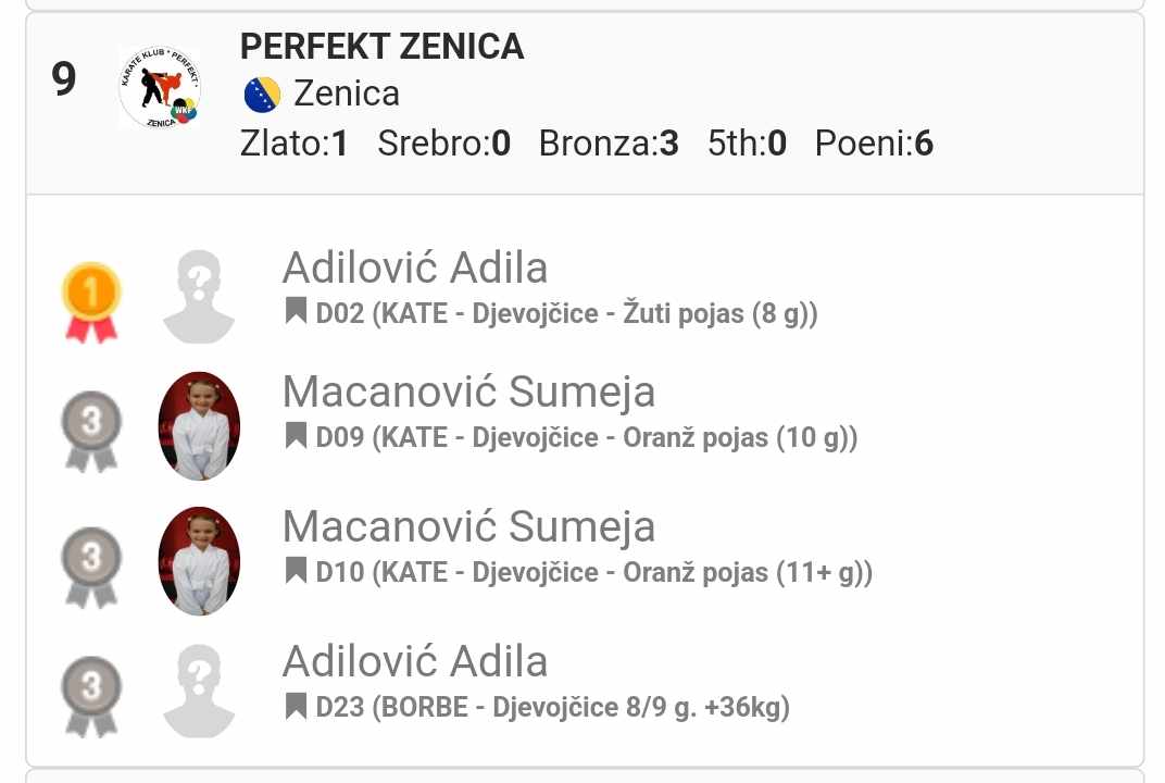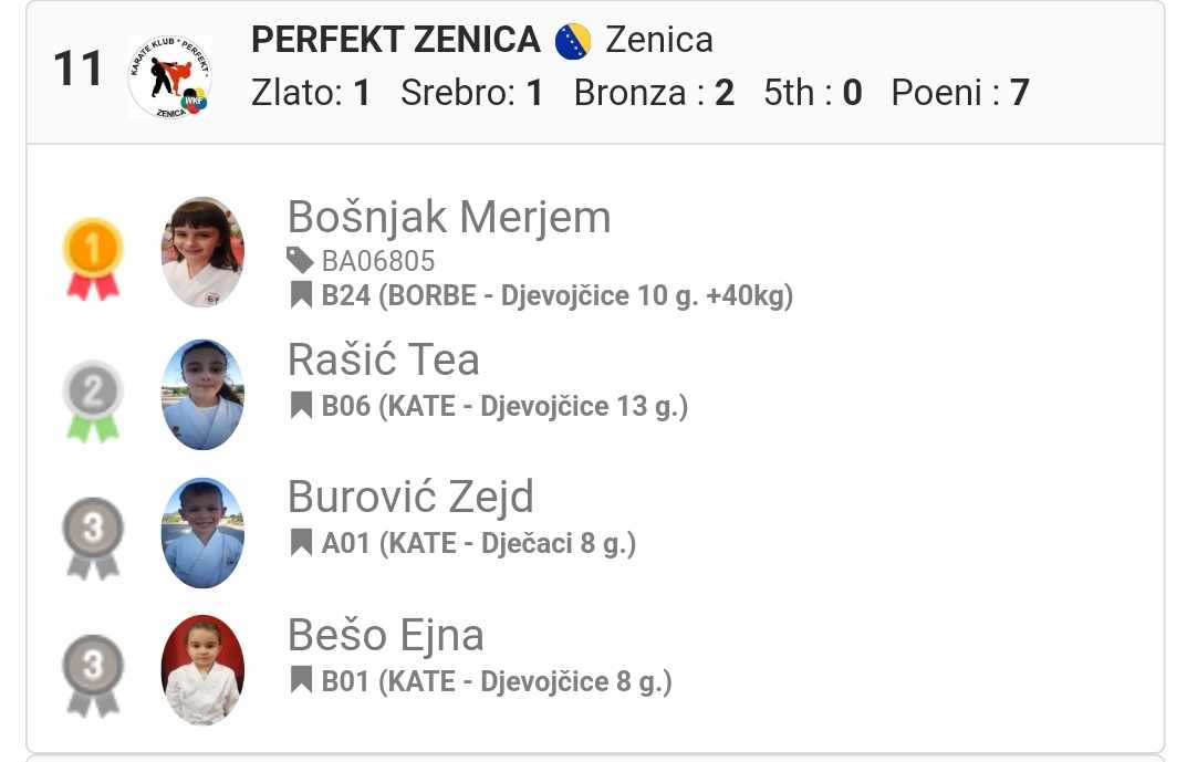 Naš Karate klub Perfekt Zenica je nastupao sa 6 takmičara u 12 kategorija / kate i borbe/, te smo ukupno osvojili 8 medalja.